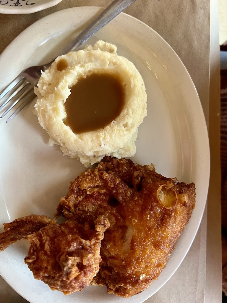 Very good dinner two pieces of chicken with crispy hash browns wonderful atmosphere friendly bartender awesome waitress just all very good we had a great nite there