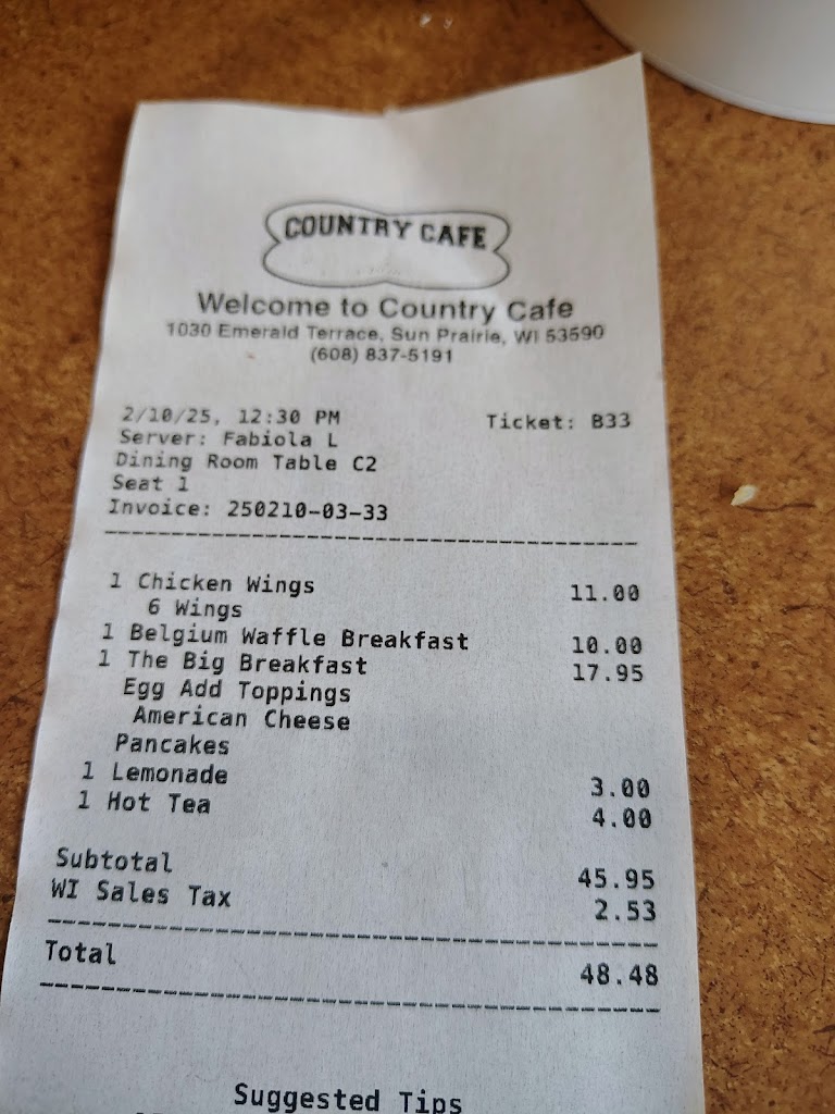 The Country Cafe turned out to be a bit of a hidden gem in Sun Prairie, especially for brunch. It's not a fancy place but it's clean and well maintained, with seating available at the counter, tables and booths. Service was very friendly and quick, with our coffee cups and water glasses refilled before getting empty without having to make a request. The somewhat eclectic menu offers a large and interesting array of breakfast or lunch choices that feature American standards plus quite a few items with Mexican and Italian influences. I really enjoyed the ground pork tamales skillet with eggs, toast and hash browns. My wife also liked her Huevos Con Chorizo with hash browns, but would have liked it to come with toast, which it doesn't. She also enjoyed the Chiliquiles she had on a prior visit. We plan to return again soon to try some of the many other items on the menu that interested us, including the pancakes that looked good.