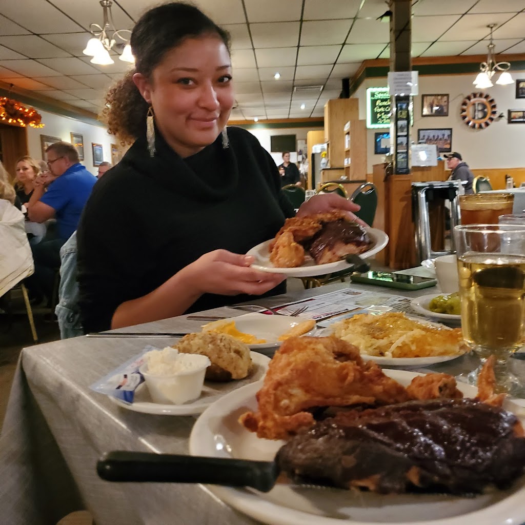 My NY strip (special this night) was 1/3 fat that I had to cut off. Server made aware but did not remedy. Steak had grill marks but was clearly cooked on flat skillet, not over a flame. Hashbrowns were on a tiny saucer and were falling off the plate onto the table. Salad bar had no peas, no eggs, no beets, no carrots, no broccoli, no cauliflower but had plenty of green and black olives and jalapeños. Server told us apps were Sysco, so no hand dipped onion rings or cheese curds, or anything not from a box. Chicken soup was 95% broth as I had to swirl serving spoon 4 times to see any noodles, veggies or chicken in it. Bill came to $71 for broasted chicken, 2/3 NY strip, cheese curds, 1 coke and 1 water. The carpet was filthy.