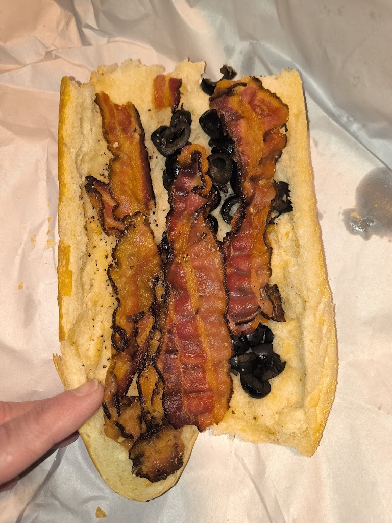 Been here several times subs don't have much on them changed big Time week ago Monday order Italian sub with bacon and black olives I was starving after long visit in ER WITH FRIEND,I LIVE 40 MIN AWAY GET HOME & PASS OUT 3 SUBS OPEN MINE THERE LAYS 4 PIECES BACON & BLACK OLIVES!! CHARGED ME FOR ITALIAN SUB BUT HOW COULD U SERVE ME THIS NASTY SANDWICH!! I WAS BEYOND UPSET I REPEATED THE ORDER TO YOU 3 TIMES!!! USUALLY GO INSIDE TO ORDER SHOULD NOT HAVE TO WASTE MONEY EVEN MY DOG LAUGHED AS HE GOT 4 PIECES BACON ON ITALIAN BREAD HE SPIT OUT THE BLACK OLIVES..ON DISABILITY GET TO GO OUT TO EAT ONCE MONTH LIVING SO FAR AWAY LITTLE HARD TO CHECK FOOD BEFORE LEAVING OSHKOSH.. horrible prank