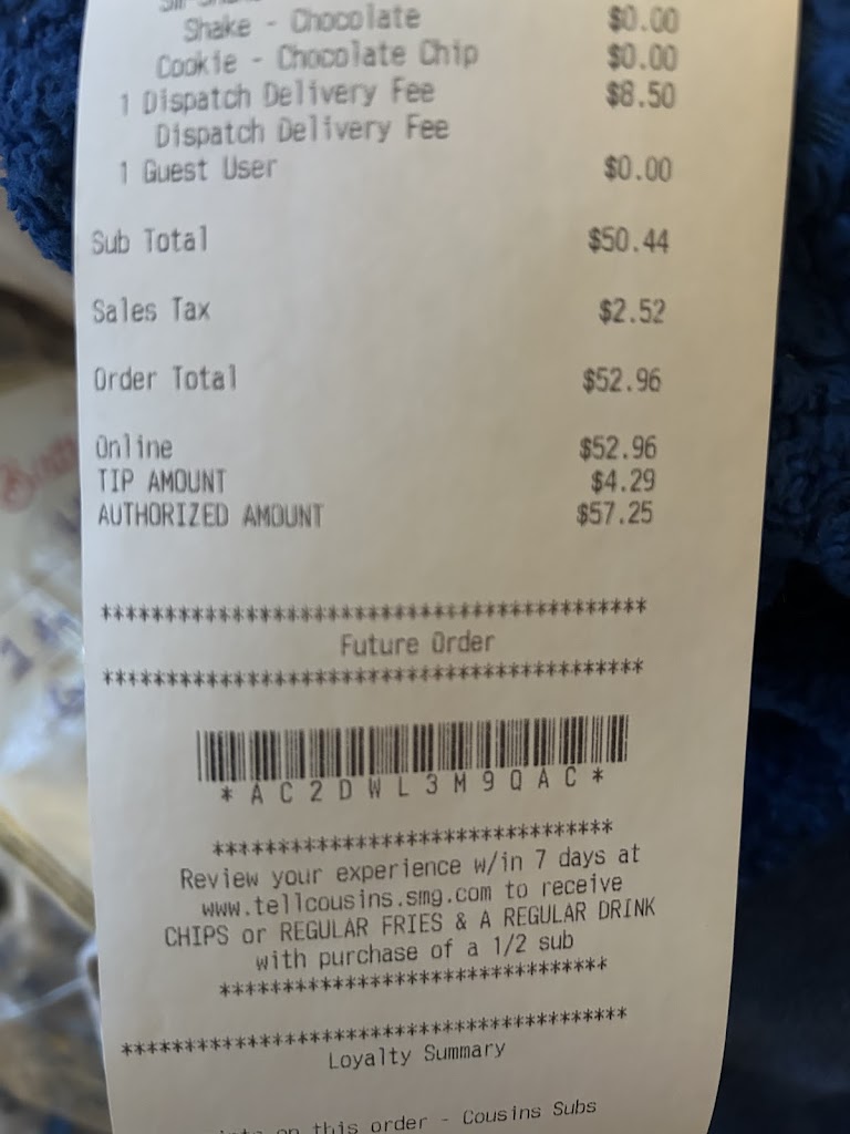 So grateful to Cousin’s manager who worked quickly to prepare food for a grieving family today. Much appreciated!!!!