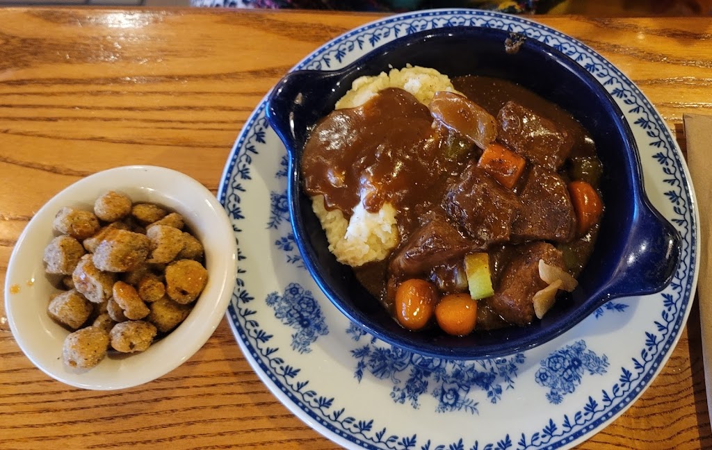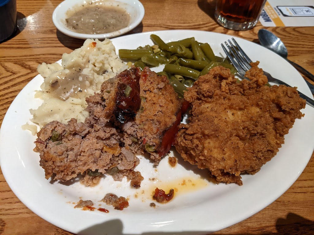 I had the meatloaf (which surprisingly didn't come with gravy). It was a good-sized serving and very tasty. My wife had the rainbow trout and thoroughly enjoyed it. The sides were good, as well. The restaurant was very noisy, making conversation difficult at lunch time.