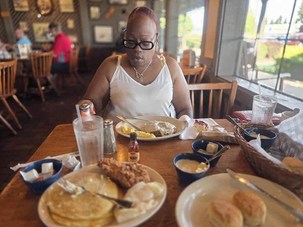 We placed our name on the waitllist through my Crackle Barrel app. We arrived we were seated in less than five minutes. Our waitress came to the table within a reasonable time she greeted us with politeness and kind smile she took our order and checked on us while we waited for our food when our food arrived the order was correct I had breakfast and my husband had lunch my eggs were a little cold but overall my meal was good my husband's food was good as well our waitress was tentative through out the whole visit we will return there again