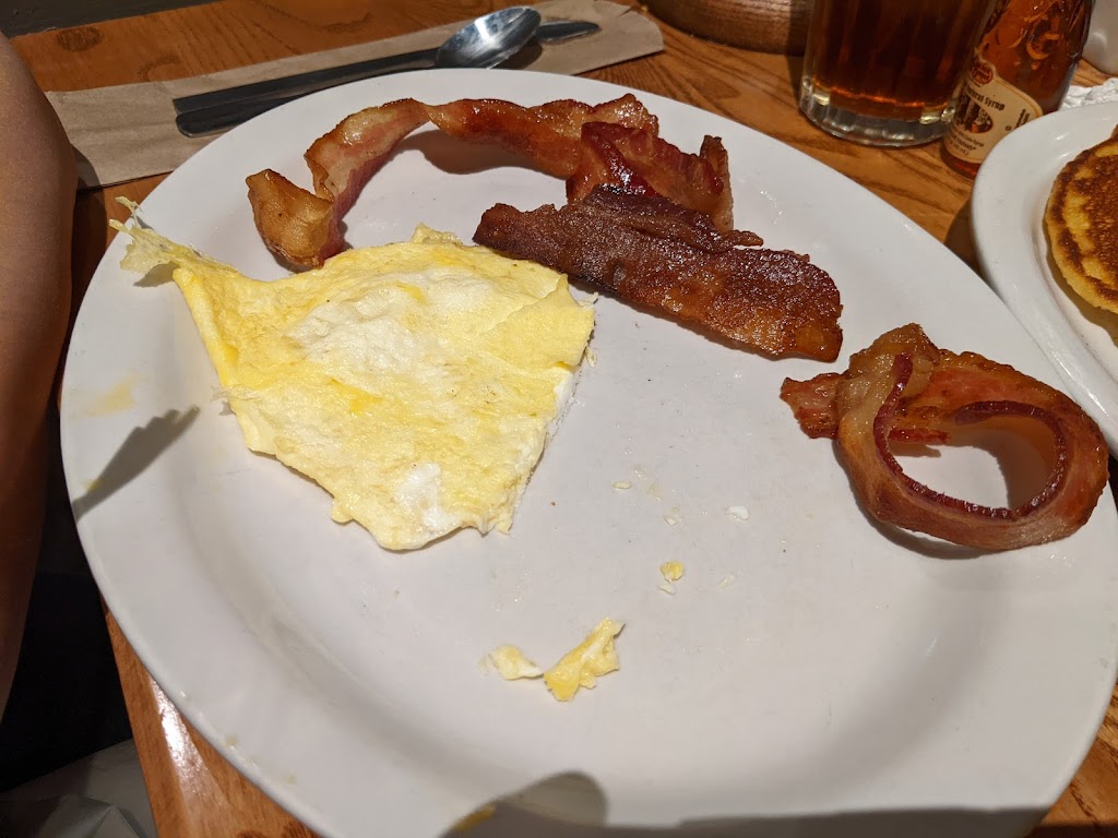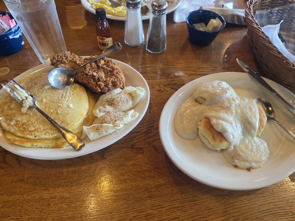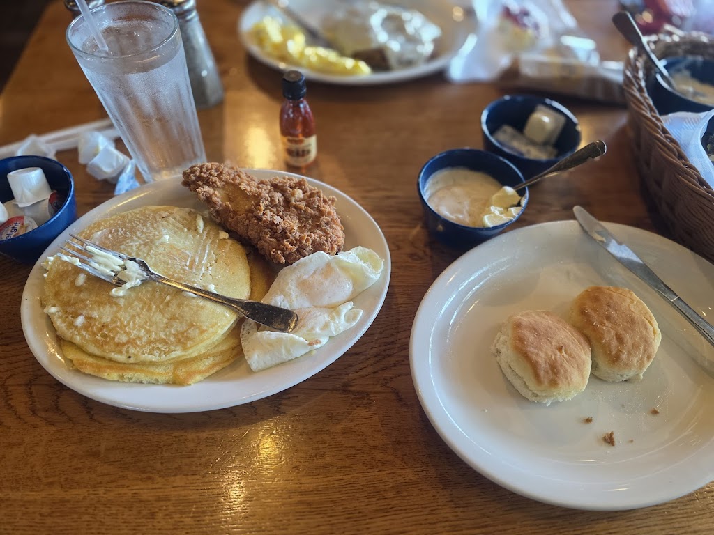 We generally have a good experience, but today was disappointing. We picked this place for breakfast on a road trip because we usually get fast service - not the case today! From start-to-finish as a table of 2, we were there an hour and a half! We had to ask for coffee refills, a spoon, he forgot the honey we had to ask for. Adjacent tables were getting their meals before us for having sat down after we did. Only when we asked where our food was was it magically “right up”. The homestyle chicken was much smaller with far less breading and overdone! Pretty sure our food was under the hot lamp for a while, it just wasn’t that fresh kind of warm.
