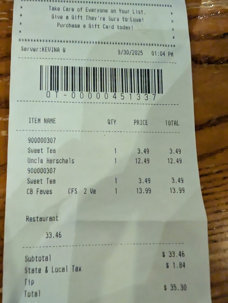 Food was hot, fresh, and delicious. Service was good but I did have to ask for part of my meal that was forgotten and drink refills were slow. But it was very clean and everyone was friendly and kind. Very typical cracker barrel experience.