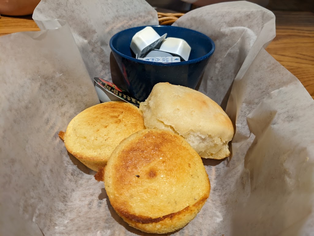 The service was pretty good. The food was okay as well. The only thing was the first batch of corn muffins came out too brown and overcooked. The waitress promised us a fresh batch but we never got them. We waited for a while before eating our food but couldn’t wait any longer.
