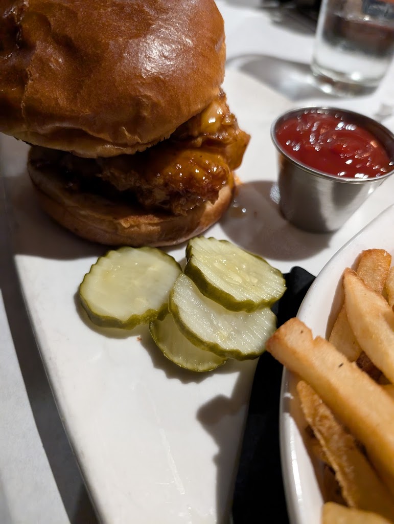 Had the hot honey chicken sandwich, it was very good, sweet potato fries were good as well. My IPA was served in the proper glass and my waitress sloane made the visit even better. She was super attentive, very friendly and cheery