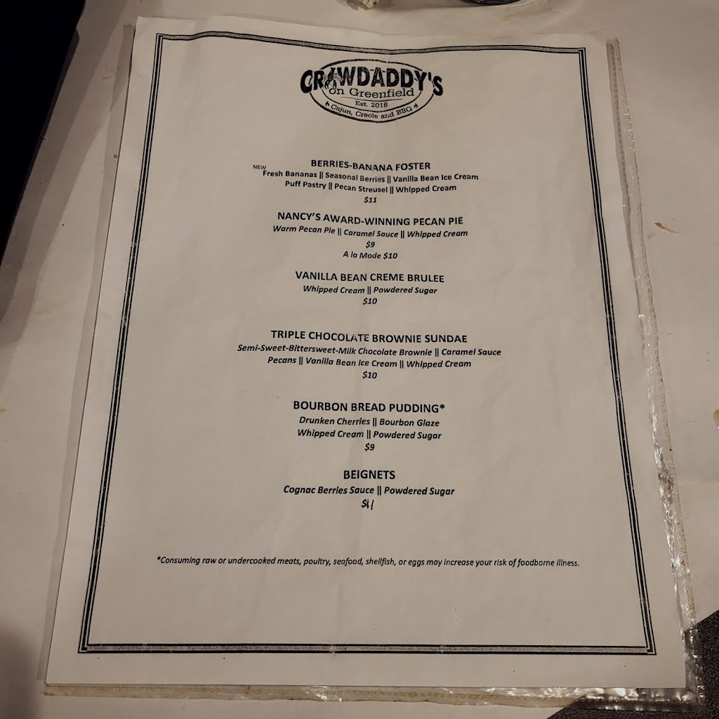 I haven’t been here in a number of years. But frequented a ton. Food came out seconds after we received our drinks, so I’m guessing none of the food was fresh. Burger King takes longer to prepare. Both of our dishes lacked flavor which was a complete disappointment especially when it was my fiancés first time and all I could do is rave to him about the quality and flavor. I had the Seafood Étouffée and every bit of seafood was old and overcooked. The greens were lacking flavor as well, first time I ever had to put a hot sauce on them. We ordered double tall for our alcoholic drinks and there was absolutely no alcohol in them at all. For what we paid and what we received I would have given 0 stars but had no choice. Needless to say I probably will not be back if this is the new norm. The waitress never even asked how our meals were. What a sad experience not how CrawDaddies use to be. On a positive note, the french fries were the best, but we did only end up getting the bottom of the bag. Not to mention there was an 18% gratuity applied to our bill. I only thought that happened on parties five or more.