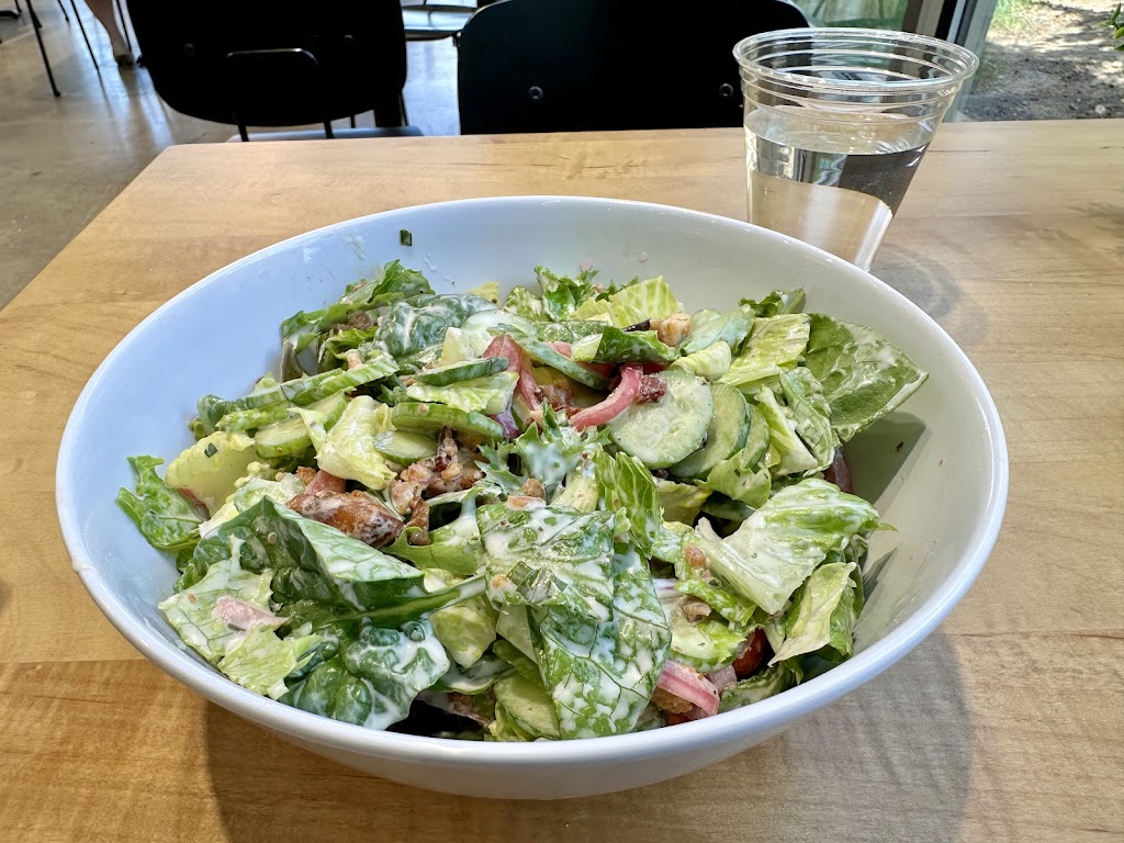 Ordered take-out. Chicken, bacon salad. Ingredients were fresh and portion was good. The dressing was amazing. I would go back, however I would consider this a paycheck salad as it was 15$ if you want something healthy and a establishment you can trust to deliver that grade of freshness and crispness this is your place.
