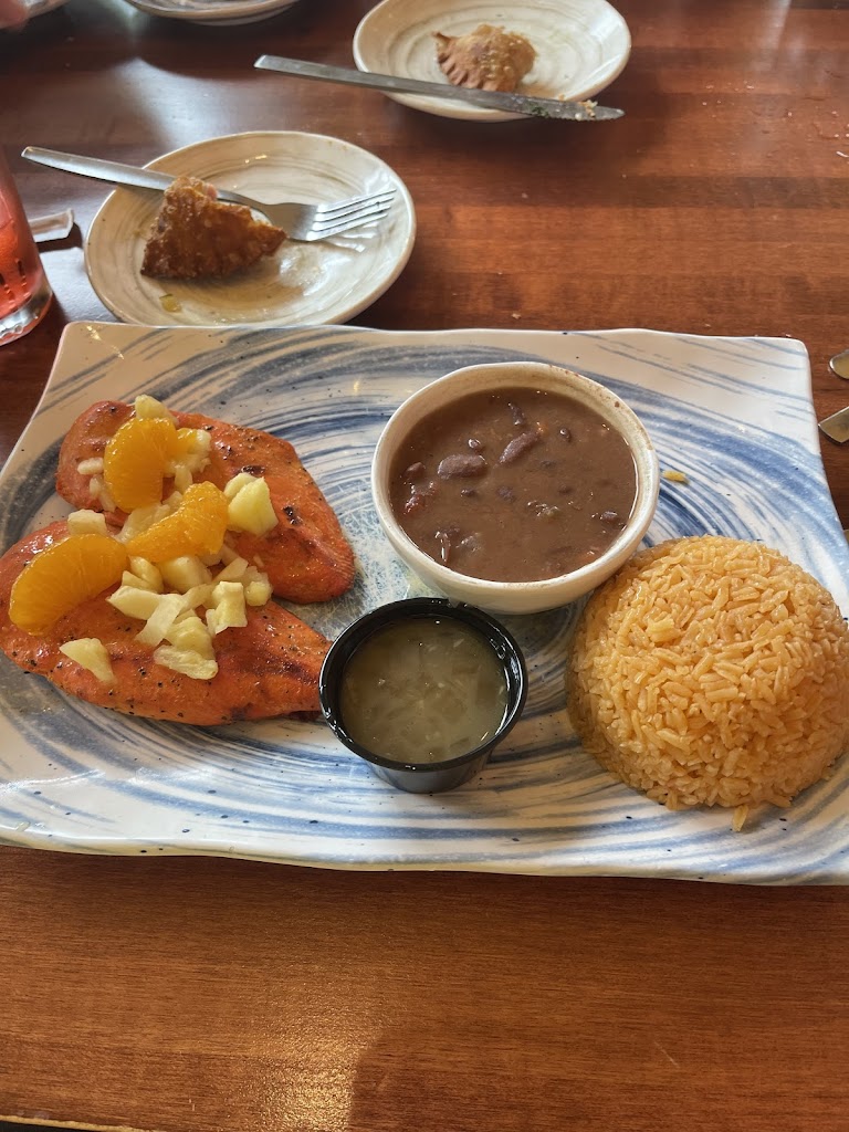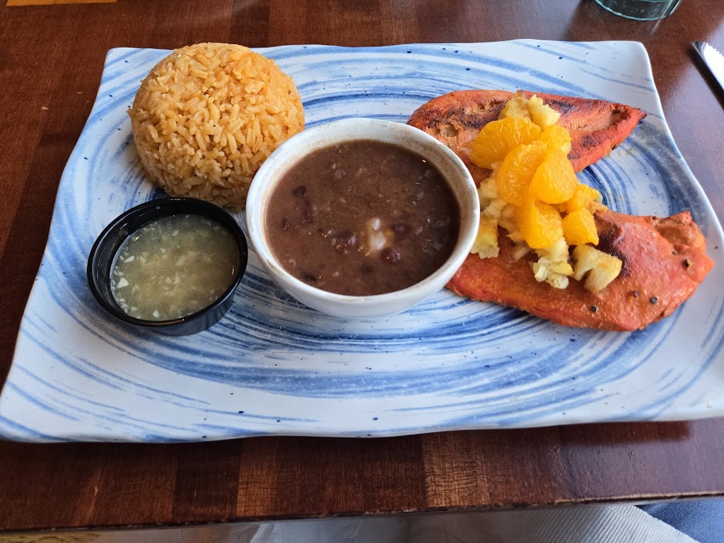 Arroz con pollo needed a sauce to moisten the dish. A mango lime sauce was added and improved the texture. The chicken with tropical juices was also on the dry side. Our waiter was friendly but a long time between visits to the table even though we requested additional drinks and sauce.
