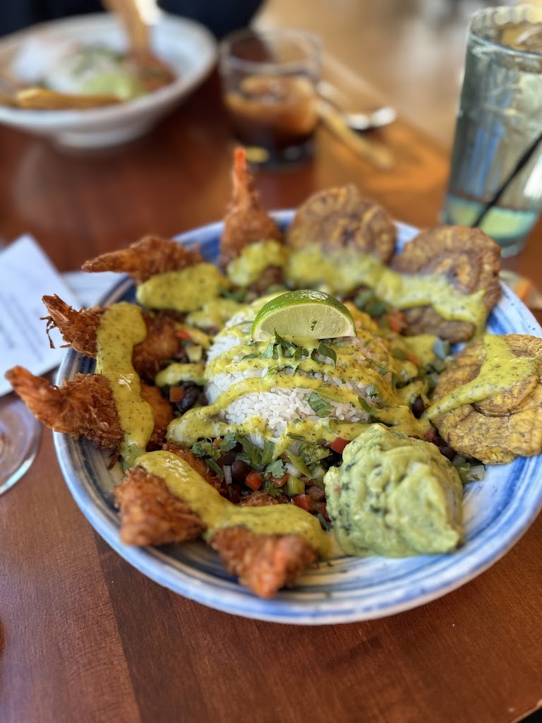 Came here for the first time, made a large reservation for 8. Waitress was pleasant and attentive. First ordered drinks, they all tasted great, but my wine glass was dirty and I could actually see lipstick smudged around the edge of the glass! She immediately brought me a new glass that was clean with new wine. The coconut shrimp was delicious but the dipping sauce was a little too acidic so didn't really use it. A few people ordered the steak with veggies. The steak was very thin and a little tough/dry. They felt that a sauce on top of it would have been better. But still seasoned well. I ordered the Vaca Frita bowl which was crispy steak as the protein. But it was shredded and seemed reheated so it was extremely hard to chew and very dry. Not crispy at all. I even thought it was pork because of the color but they assured me it was steak. Everything else in the bowl was perfect, especially the sweet plantains. But I do not recommend the steak in any form. The tables felt sticky but not sure if that was the finish of the table or not. Salads were huge and fresh, and the chicken bowl was delicious. For what we paid I feel it fell short. And then was finishing my wine after paying and another large group came in and they asked us to leave cause they needed the tables even though we were surrounded by empty tables so that was awkward, we would have been leaving in 5mins or less anyways and the restaurant was about half full. Not sure I will be back.