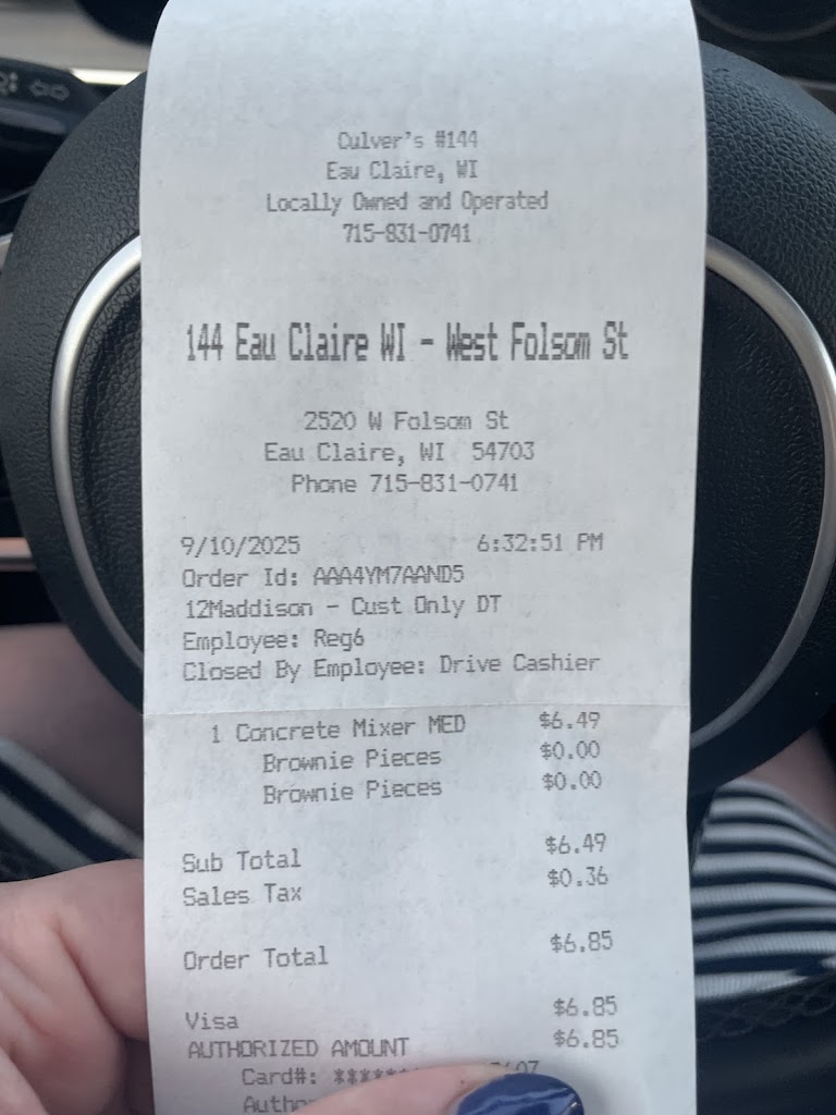 Decided to get myself a sweet treat tonight – a concrete mixer with brownie pieces. Nothing crazy, nothing abnormal. I waited for over 20 minutes before someone approached my car. I explained to her I just had a concrete mixer with brownie pieces and showed her my receipt and mentioned that I had been waiting for 20+ minutes now. Shortly after she came back out with my concrete mixer, which was practically soup. She stated that it was in the wrong location, but gave me extra napkins because the cup was sweating. And maybe I’m just extra sensitive because I’m eight months pregnant, however, Ive never been so disappointed in a Culver’s before. The least they could’ve done is remade my concrete mixer.