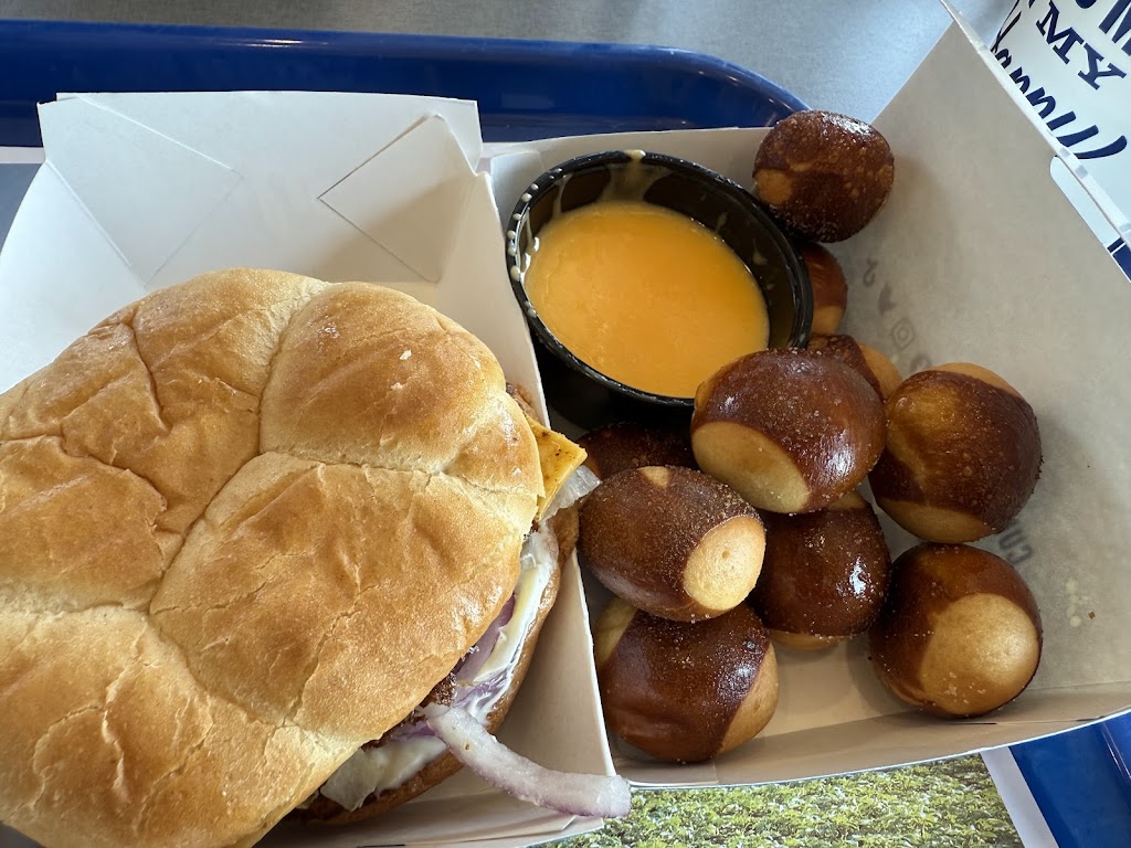 Super clean place to sit and eat, very good fast food, thank you Annaka for helping me order! Cheese curds, pretzel bites, and the pub burger were so good. Never had custard before was also delicious. Definitely recommend!!
