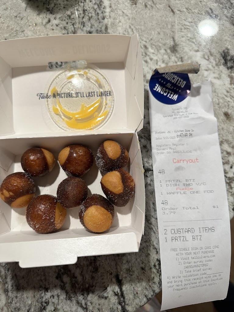 I ordered the flavor of the day which was crazy for cookie dough and Culver’s left out the cookie dough! Just got vanilla and chocolate ice cream in a cone. What a disappointment. Also I ordered pretzel bites were over salted and not edible. Not what I expected from Culver’s.