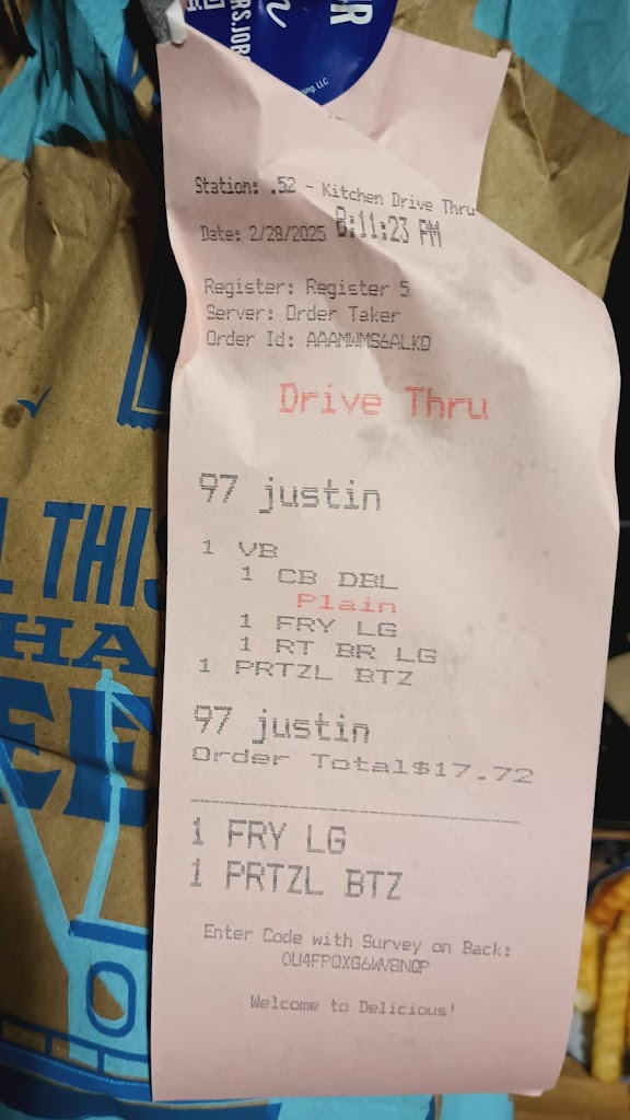 I got to the window and the young lady Camryn handed me 2 sodas and I asked about my 3 she took the time to explain that the order got mixed up and I only ordered 2 baskets and offered to make my burger a basket for me and got a Team Lead to do that she was very patient with me Great Job