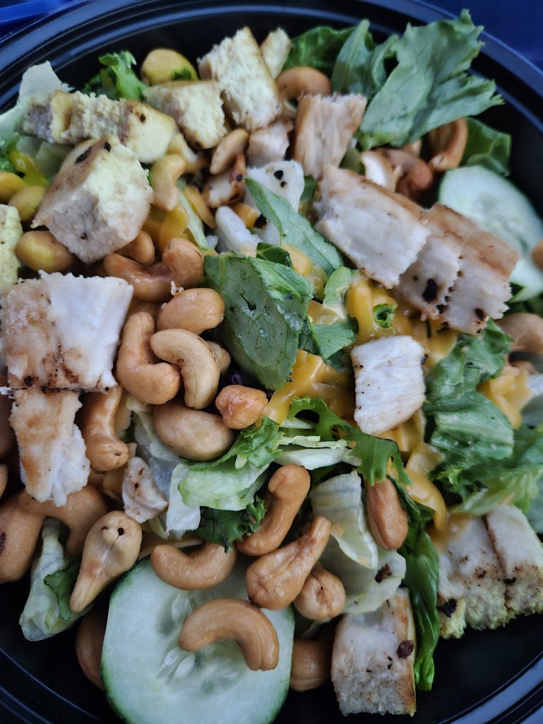 Had the chicken cashew salad. Salad was good but something wasn’t right with the chicken. It was crunchy rubbery. I have no clue if it was undercooked or overcooked, but I couldn’t eat it. I picked out the chicken and finished the salad.