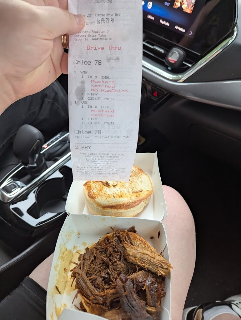 We ordered 2 double butter burgers and when we got home one was a plain pulled pork sandwich. Who orders that? Felt like on purpose since they were rude to me.