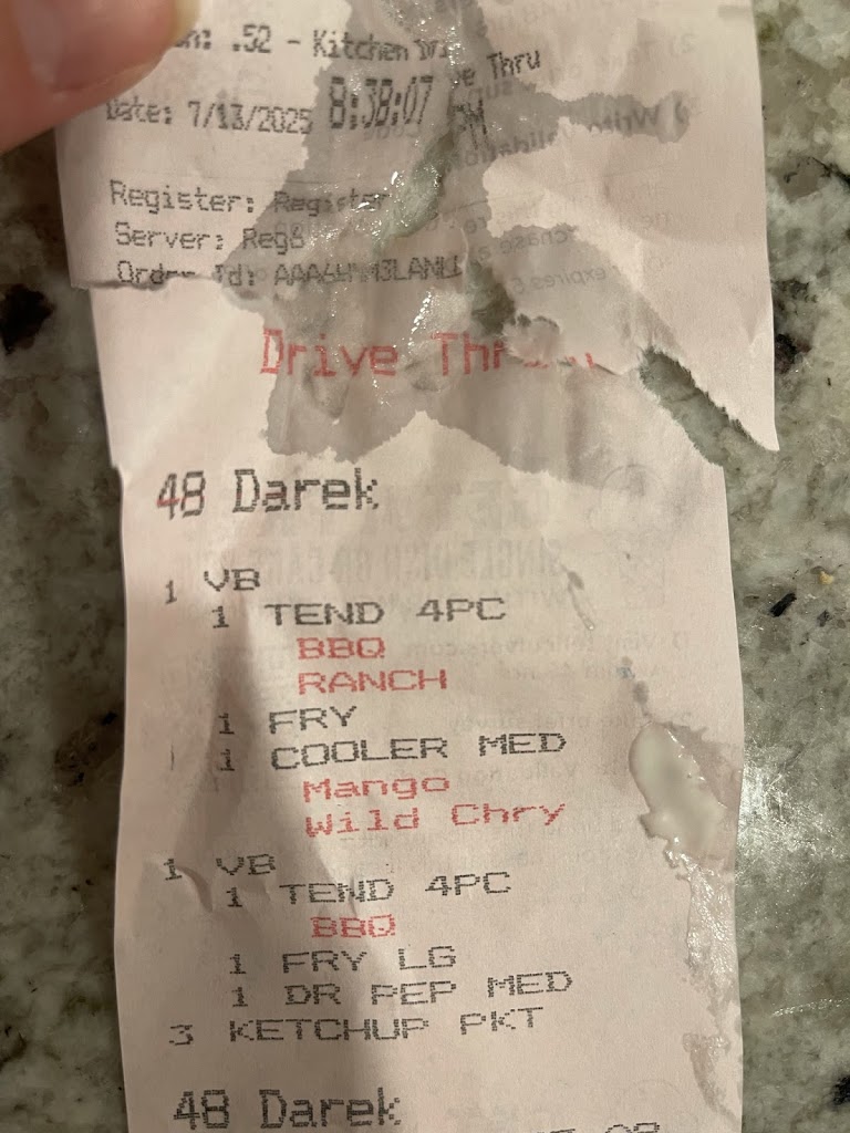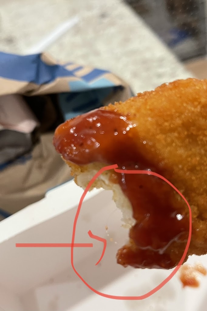 Fast forward to this year, my husband wanted to give this location another chance since it’s the closest one to us. He ordered chicken tenders — something simple — and while eating, we discovered yet another hair cooked into the breading of the chicken.