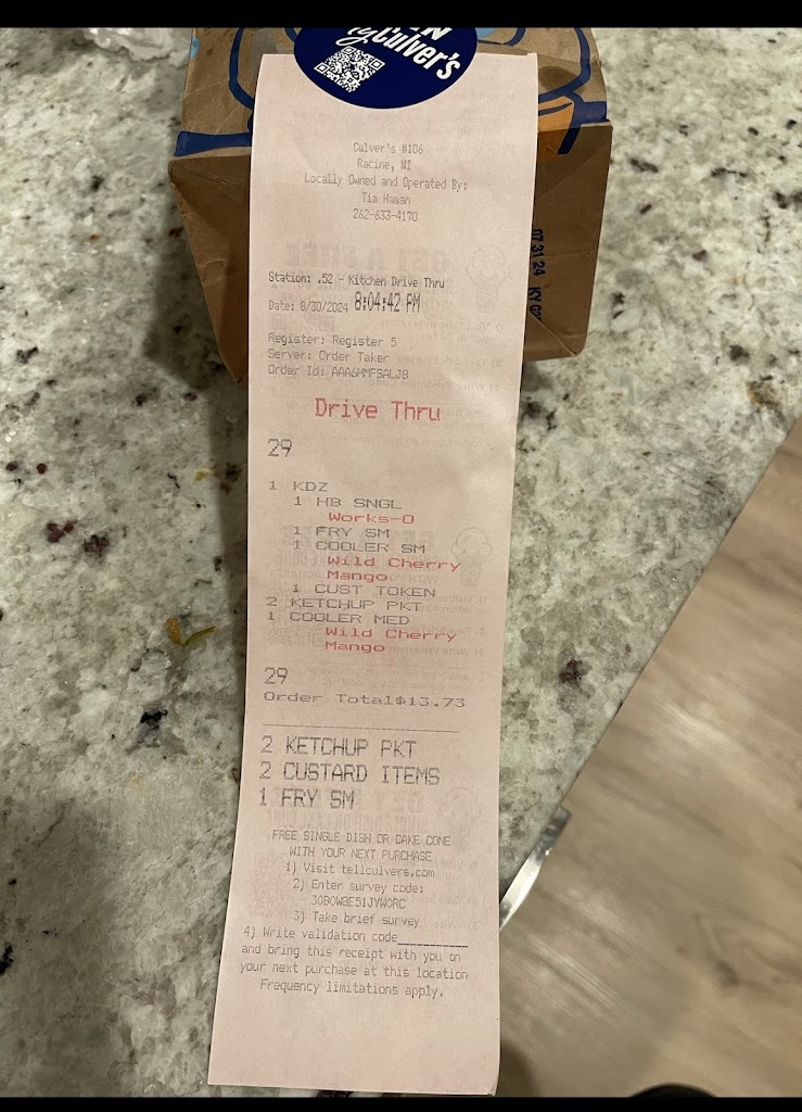 So I gave the drive thru lady a coupon she told me the same total before and after the coupon and I asked did she use the coupon when she was handing back my change. She said yes. She didn't. Shooed me away and didn't give me a receipt. Culver's steals your money.