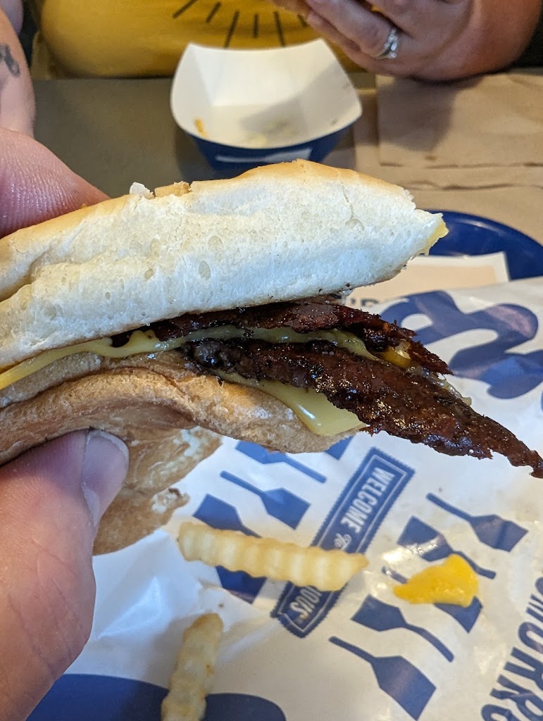 This rating is for tonight only. 7:30 pm 7-23-23. Obviously some issues for them tonight. After ordering, waited over 15 minutes in line to get food. They had 4 lines of traffic, way behind. Then get the sourdough melt, it is not toasted well. Not much worse than soggy wet bread.