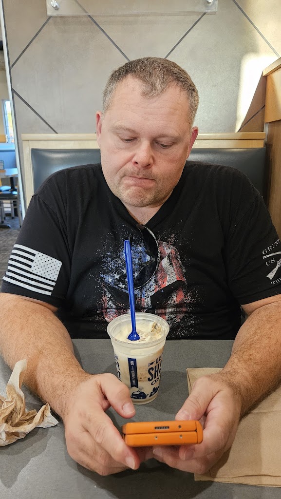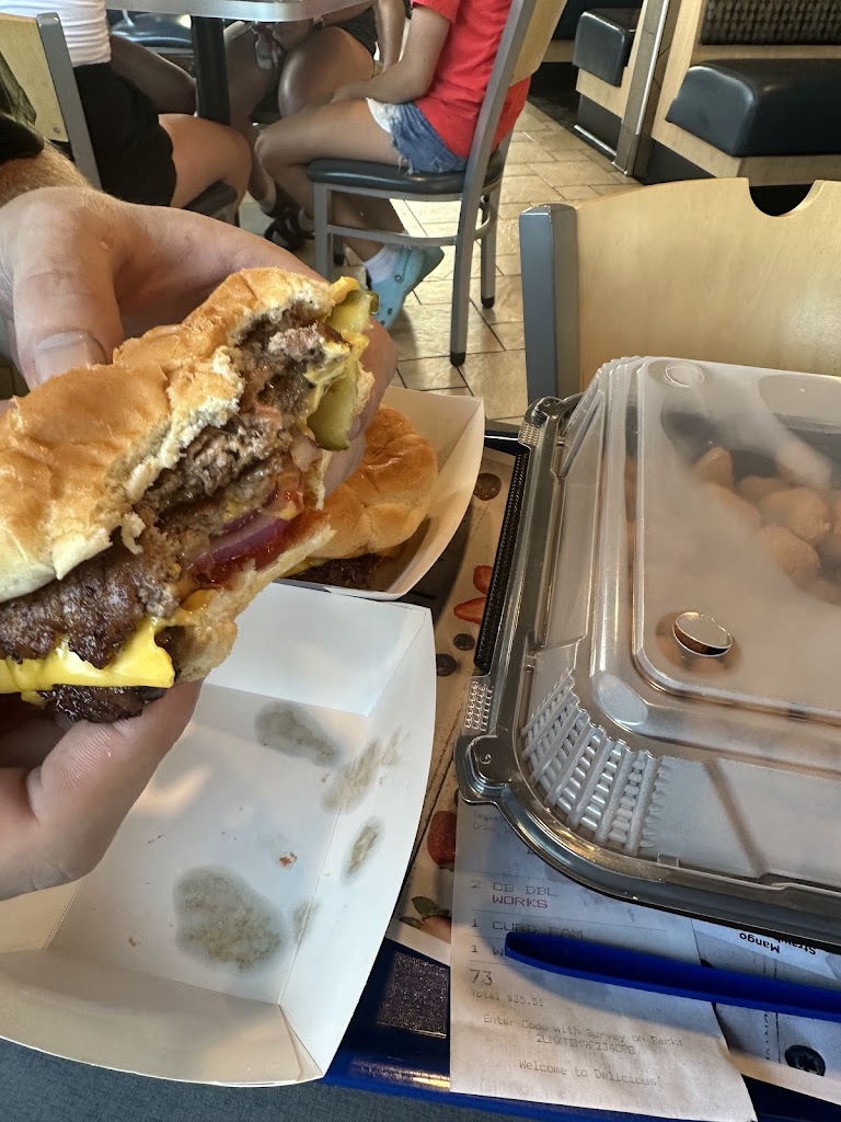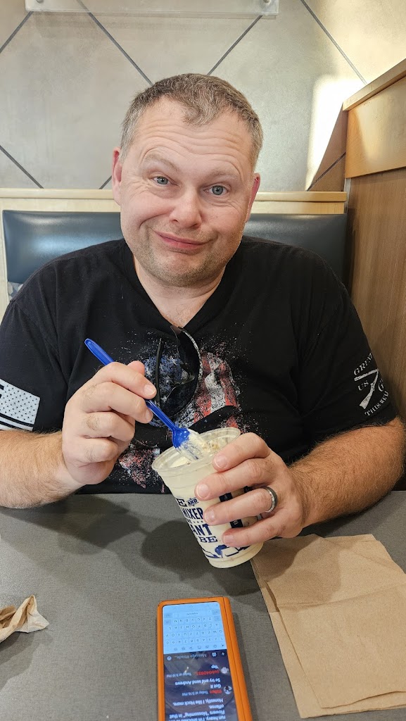 I ordered a Culver's bacon deluxe burger and it did not disappoint. It was so scrumptious and was quite a good burger. This one worker I wish I knew his name. He was so friendly and was a delight. He was cleaning a table next to ours and he gave me a free scoopie token he found. 7 stars for him.