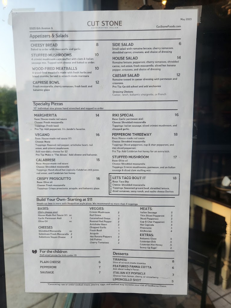 Great pizza and great service. The owners are very personalble and both serve and make the food themselves. If you support small businesses, definitely consider Cut Stone rather than a pizza chain.