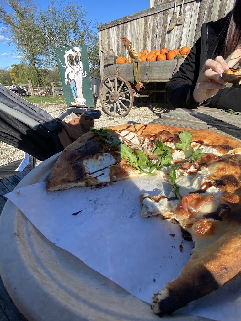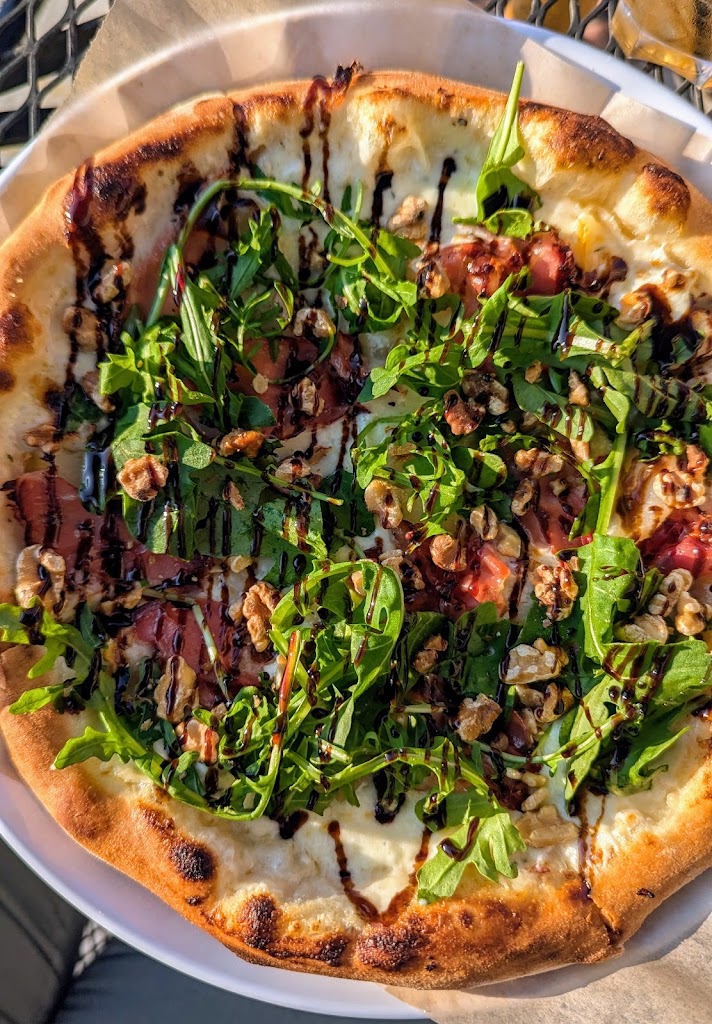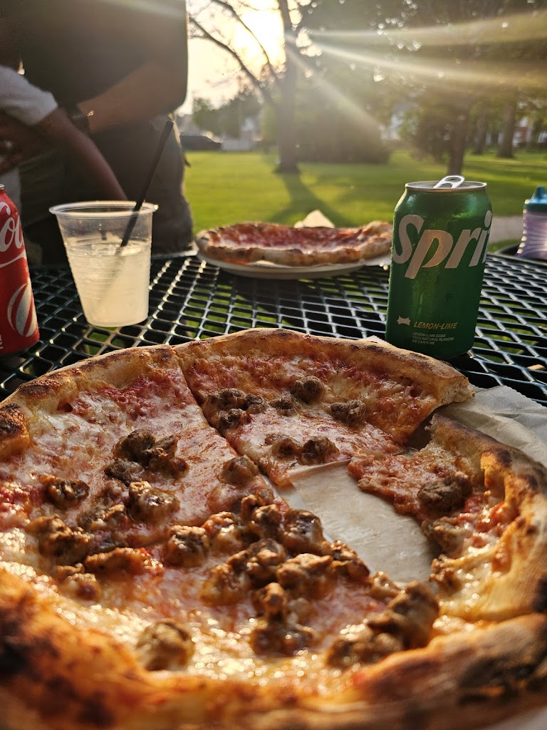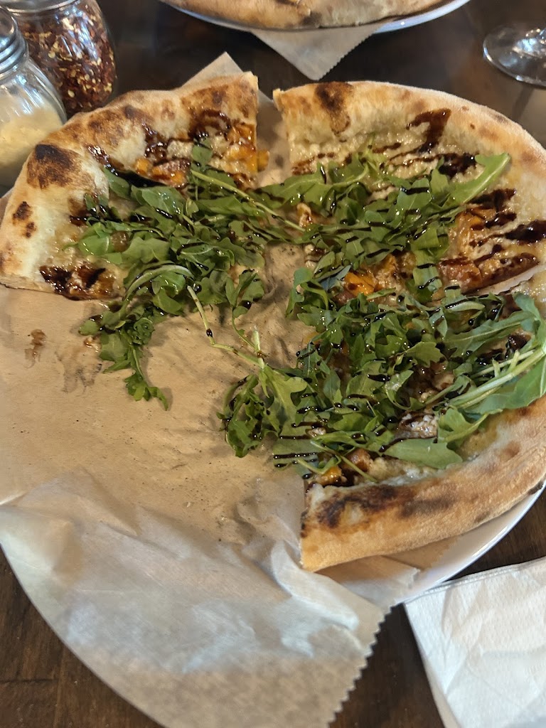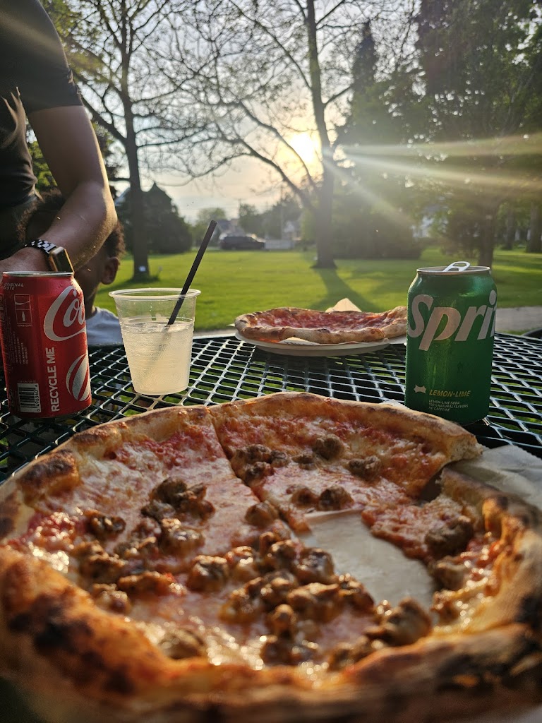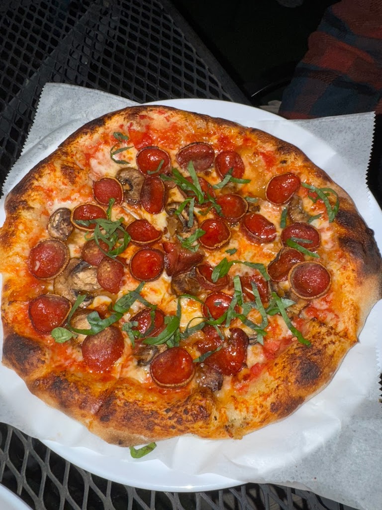 The first thing that hits you walking up is the incredible pizza aroma. They make their pies on an old fire engine—such a cool touch. We ordered at 6:45 and our food came out around 7:35, so there was a bit of a wait, but it was worth it.