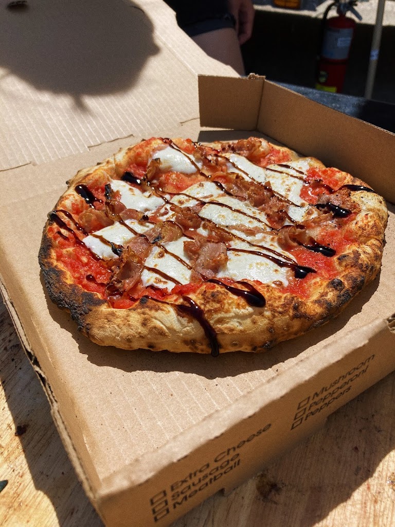 One bite everyone knows the rules. I’d like to consider myself a pizza connoisseur. Don’t get me wrong I’m no Dave Portnoy but I think even El Presidente himself would score this pizza ridiculously high. Great food and an awesome food truck experience. Keep it up Riki!
