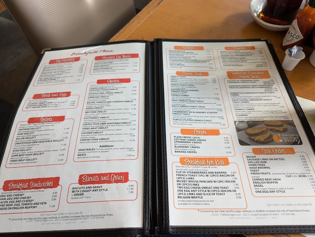 Every meal I have tried so far has been delicious. The chicken fried steak and eggs is great. And their home fries are cut up cubes of perfectly seasoned, crispy potatoes. A must try. They are fantastic. Great atmosphere and bright, comfy. Fast, friendly service. Chef is rocking the kitchen. Great prices. Must dine here. Nice variety on the menu and daily specials. I tried the Greek Gyro Omelet the other day....wow! 😋 Also try the Carmel Pecan Turtle stuffed French Toast. Yum.