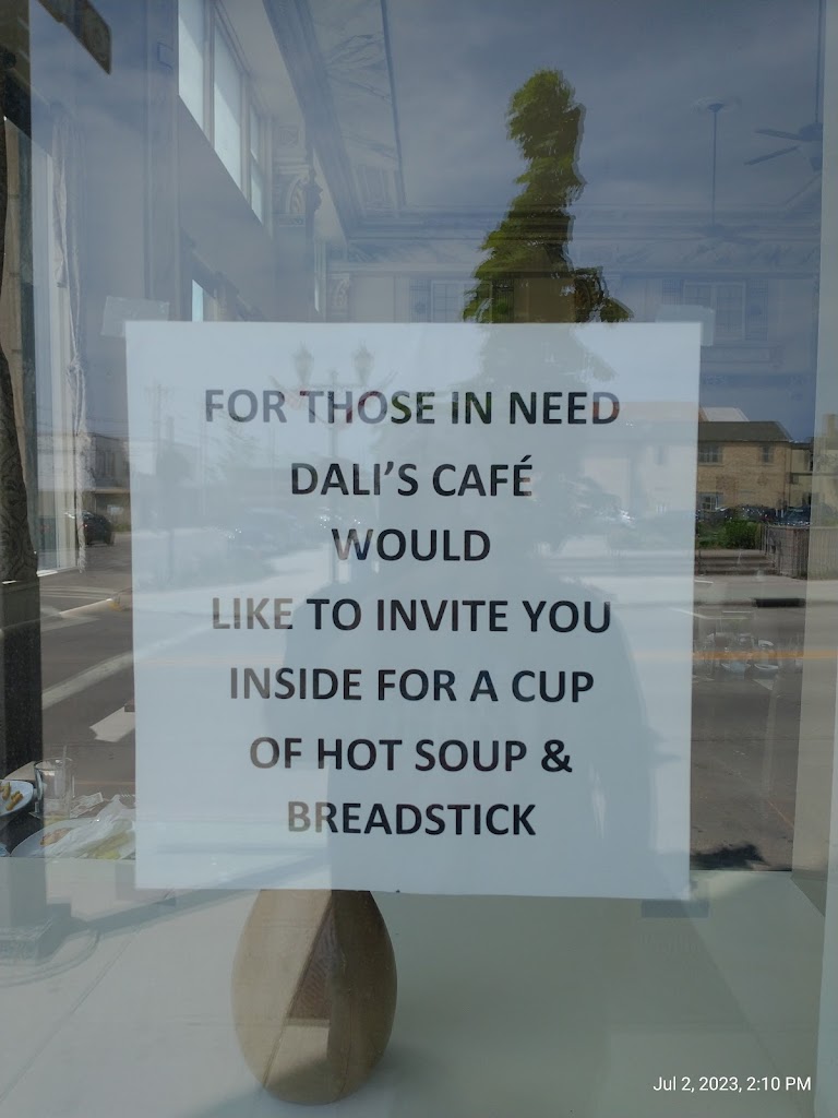 Can’t say enough good about Dali’s. Very sad it was not open on Monday so we could get one last meal on our trip. The owner and her family are very hard working and sweet. Not to mention the sign on the window that tells those in need to come in for a warm soup and bread.