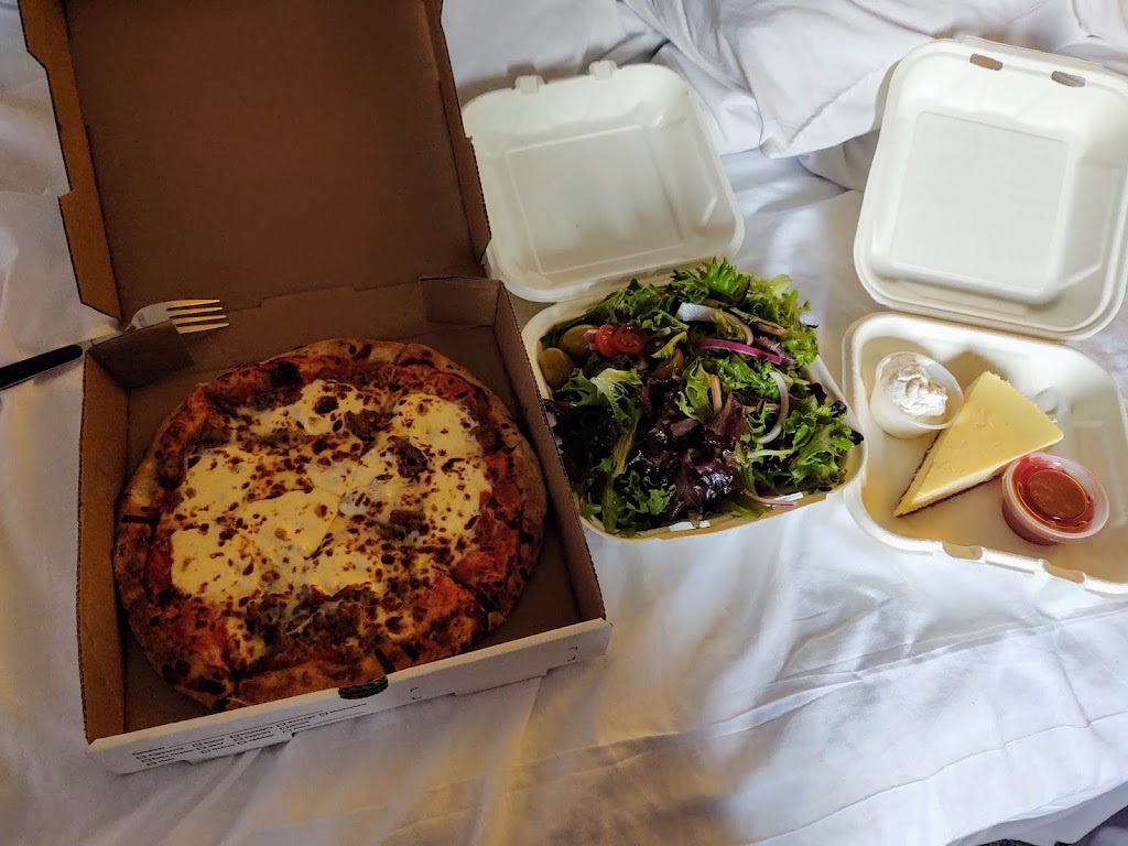 In town on vacation, my wife and I ordered a jerk chicken pizza, margarita pizza, two small salads, and the peanut butter chocolate pie.