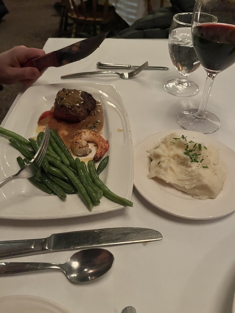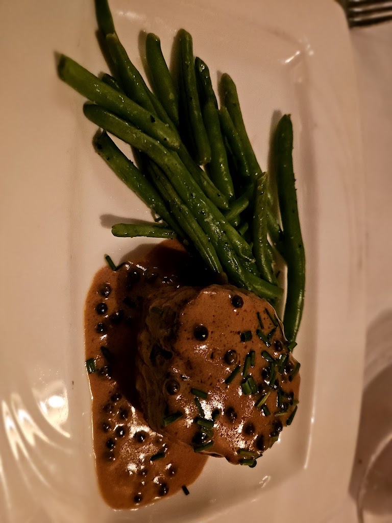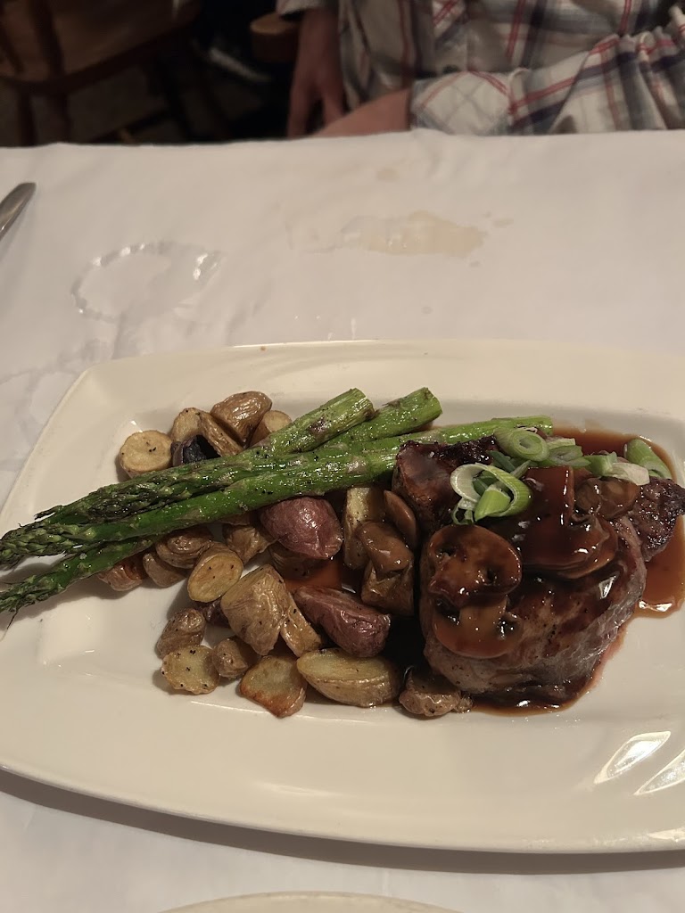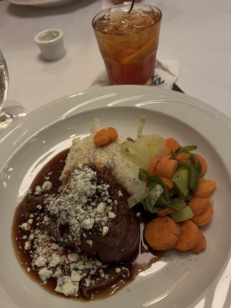 Gray food. Delicious steak and meat dishes. Very experienced wait staff - all highly professional and long tenured. Filet is tasty and we’ll prepared. Not a large dessert menu but what they offer is very good. Their Wisconsin brandy old fashioned is very tasty and nicely done.