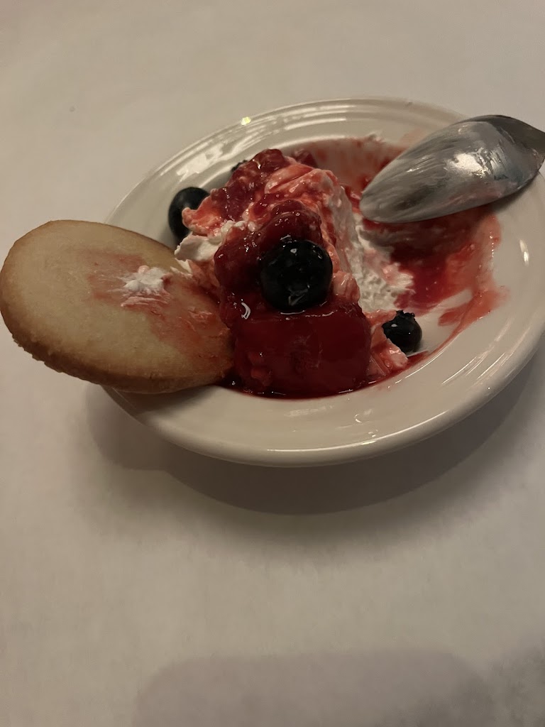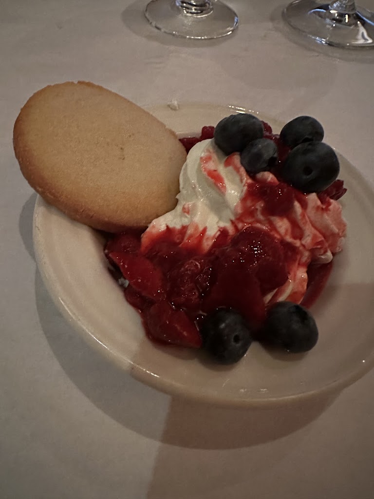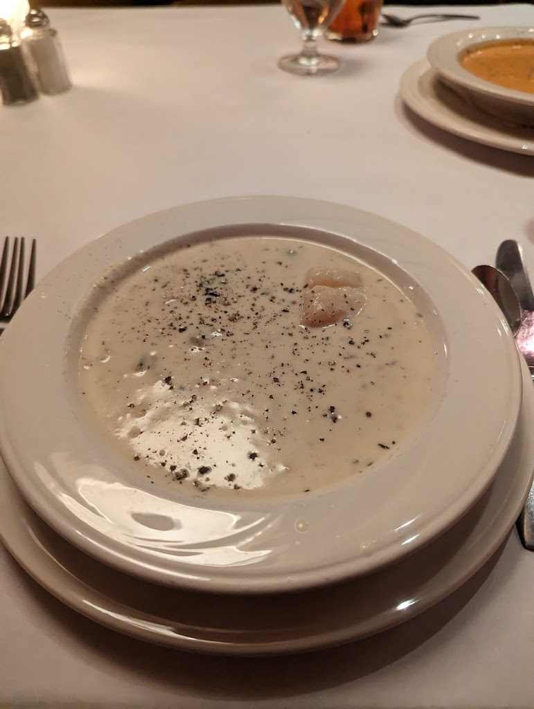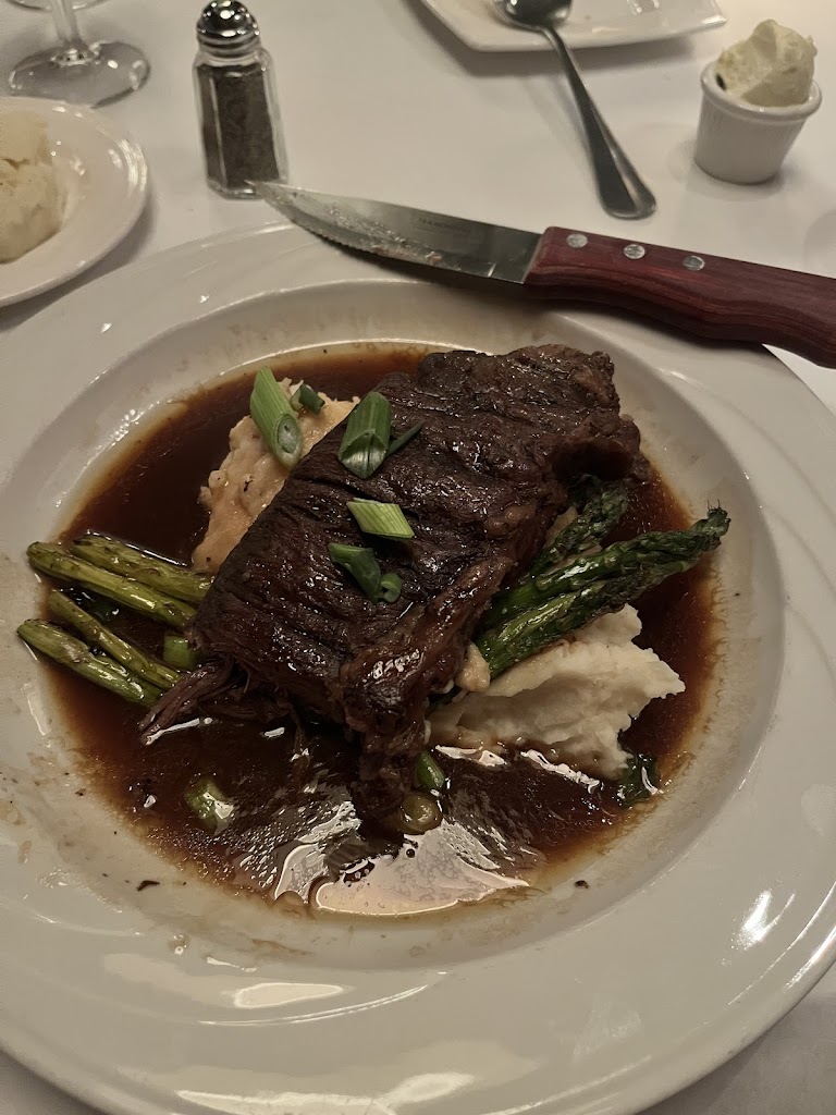 Gray food. Delicious steak and meat dishes. Very experienced wait staff - all highly professional and long tenured. Filet is tasty and we’ll prepared. Not a large dessert menu but what they offer is very good. Their Wisconsin brandy old fashioned is very tasty and nicely done.