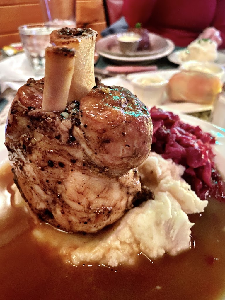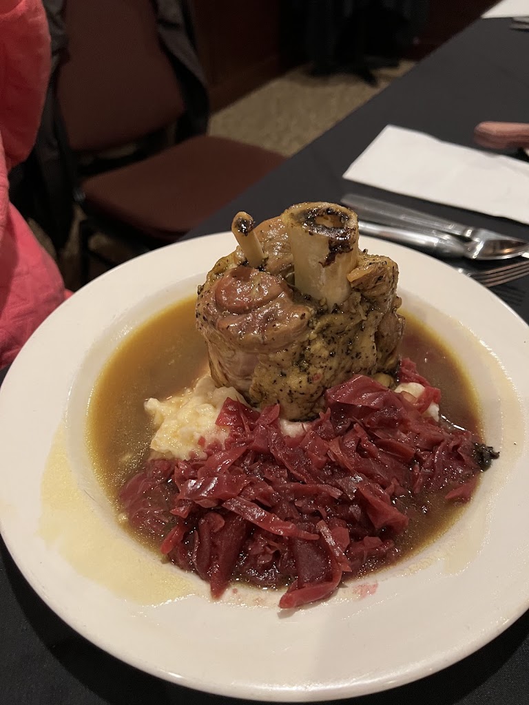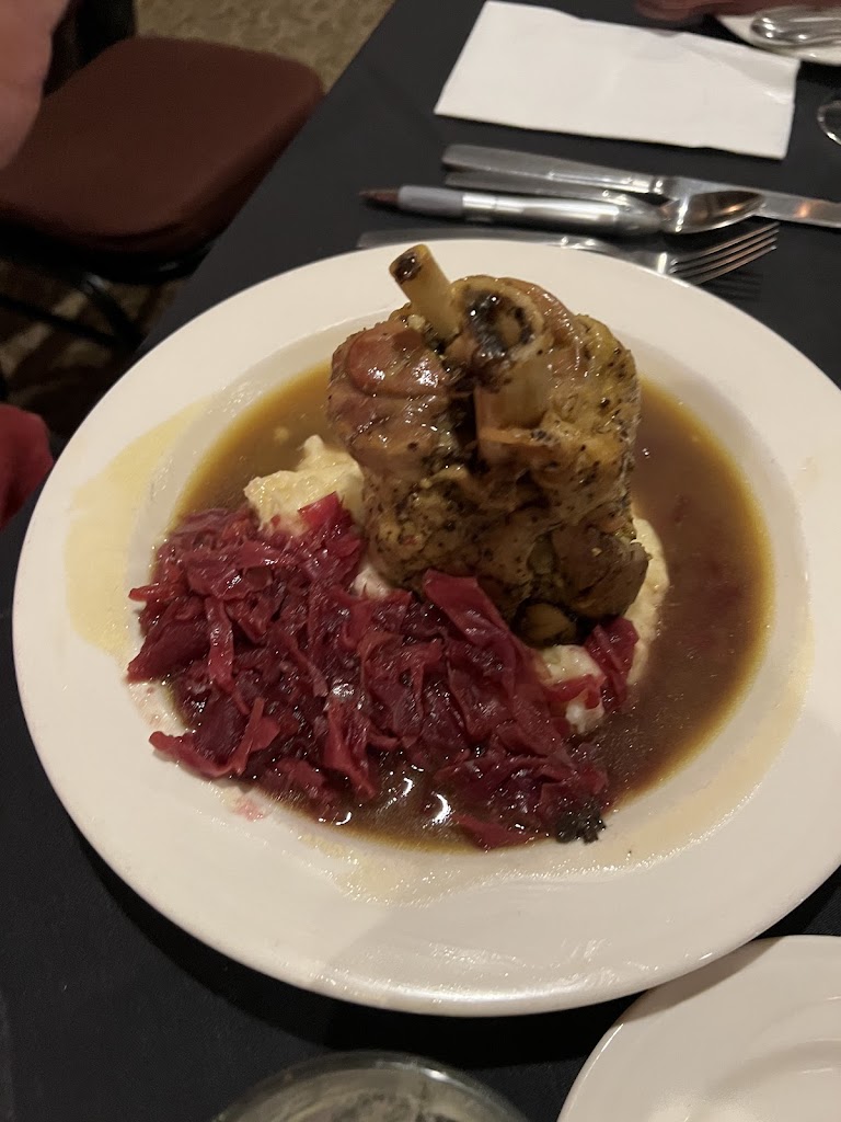 Tonight we had the crab cakes followed by the pork shank with mashed potatoes and red cabbage and the six oz filet with mashed potatoes.