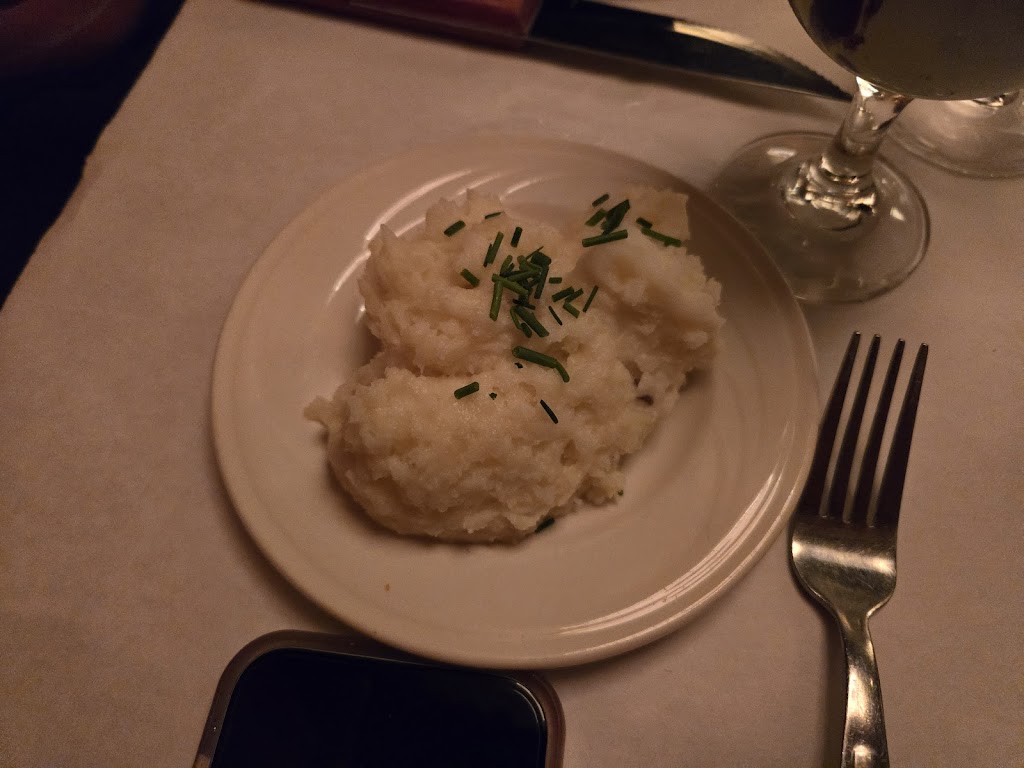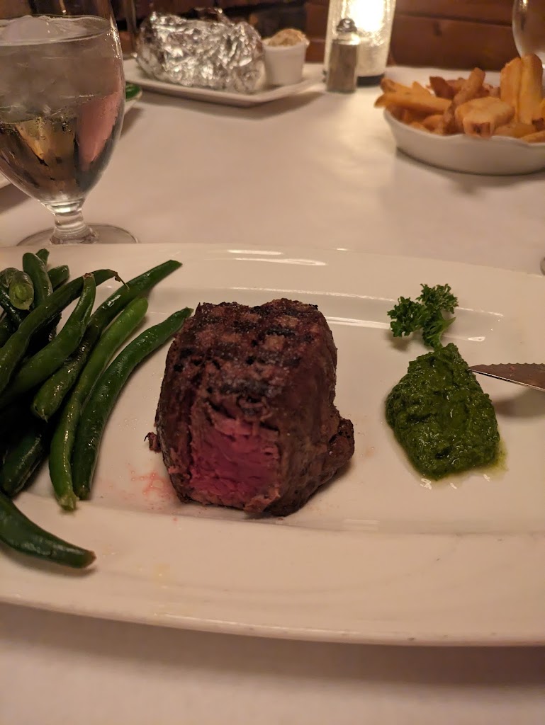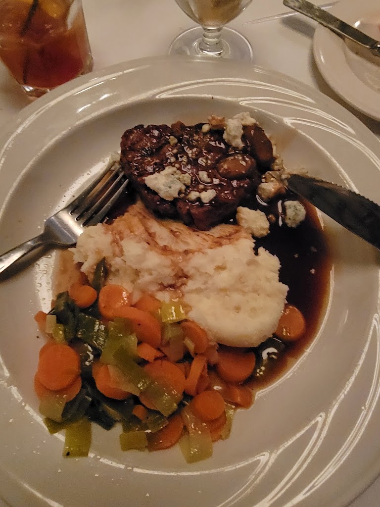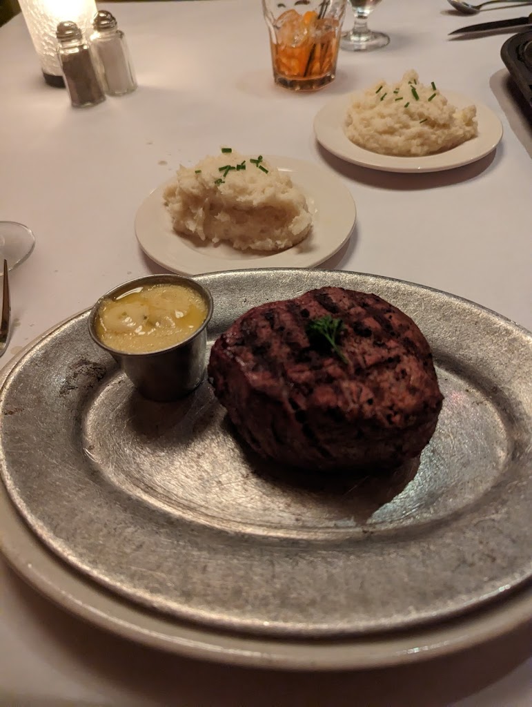 I sat at the bar as it was prime dinner time and I didn't want to wait. The service is phenomenal. I will state that I would hard pass on the fillet mignon. It was cooked to order, but it was the toughest fillet I have ever had. They do not season the meat with anything. Also it had the most off putting taste. I didn't even eat half of it. If anyone had asked me how I liked my dish, I would have said something, but alas no one ever did. Not even when they took the plate away. Anyway, I might give the restaurant another try with a different dish, but for the prices they charge, one could go elsewhere for half the price.