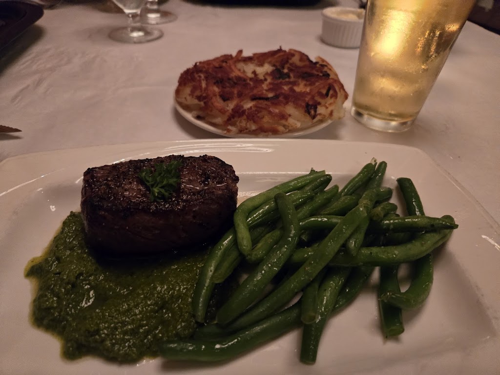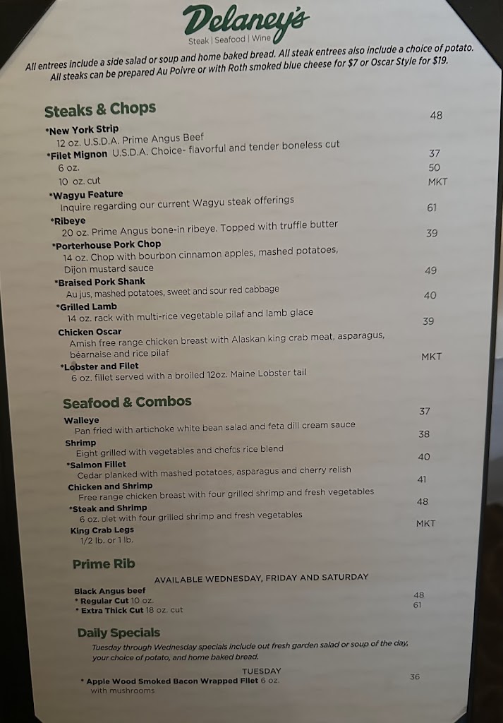 Wow! A restaurant that still does it right! Meal was paced nicely, food was fabulous. Most places are a day late and a dollar short, but Delaney’s is still on top of their game. I had filet au poivre and hubby had ribeye. Get the hash browns!