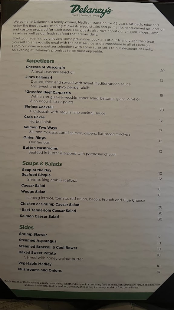 We have been to Delaney's many times over the last 30 years and believe this is a Madison treasure. We came when Jim Delaney was the evident host every night and had our first and greatest salad bar there. We returned tonight on Jan.24, 2025 during restaurant week and, as always, had a spectacular dinner. The cocktails are very good, the onion rings are unbelievable, and every dinner - steak or seafood is outstanding. The restaurant itself is so comfortable with a very moderate noise level. We will return and highly recomment Delaney's.