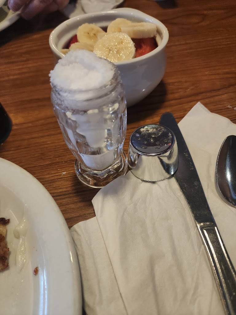 The salt shakers are way too full that nothing comes out of them. They had to bring packets. Here is an idea ditch the shakers and just have packets at the tables...problem is solved with moisture and overfilling the shakers. Denny's please do better with this.