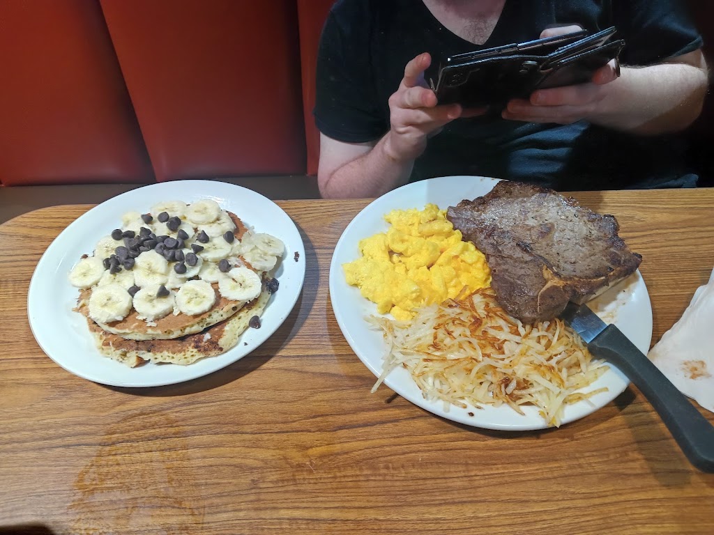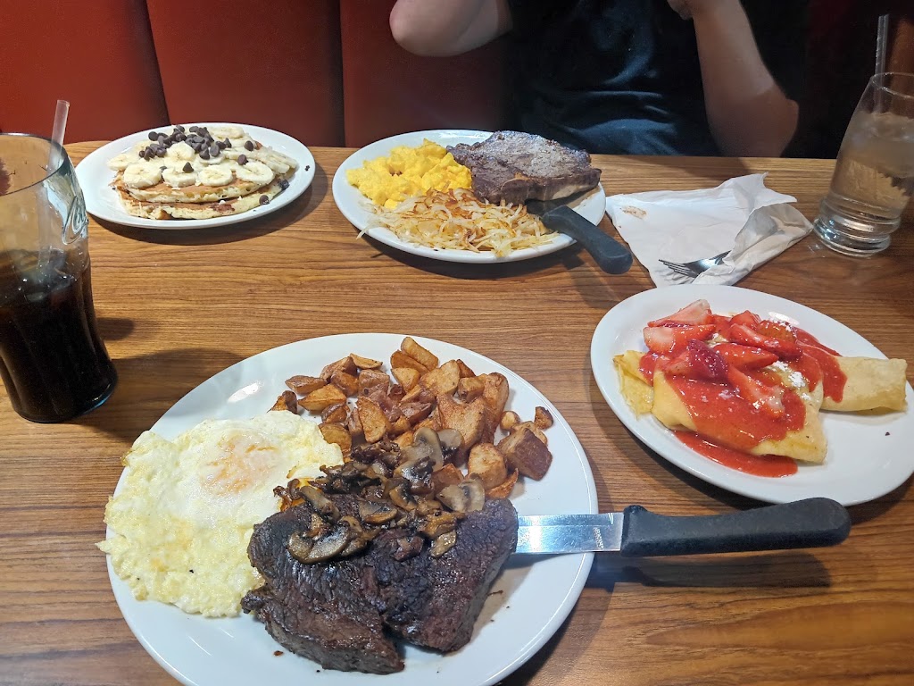 I had the ultimate omelet and my date had the steak omelet and we had pancakes food was hot delicious clean good sitting great way to start the day.