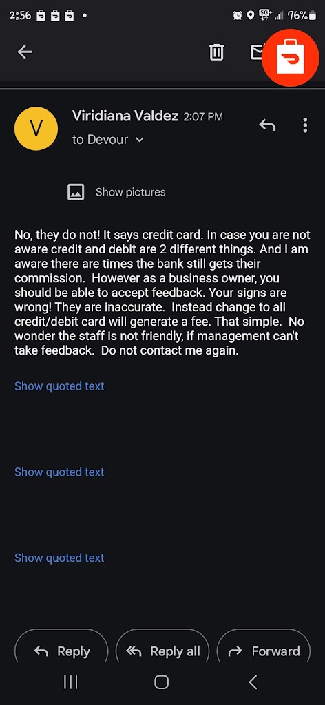 I never complained to you regarding breakfast. I saw the time and that's why I did not order as that's what we were going to order. If I choose to buy breakfast before 1pm, I am within my right!! THE SIGN DOES NOT SAY ALL CARD!!!! YOU DONT WANT TO TAKE OWNERSHIP ON THE RUDENESS OF NOT AKNOWLEDGING WHEN SOMEONE SAYS HI WHEN THEY COME IN. OK. WHAT CAN I EXPECT FROM THR EMPLOYEES IF THE OWNERS ARE A JOKE TOO!! You want to be shady and lie. Go for it!!!