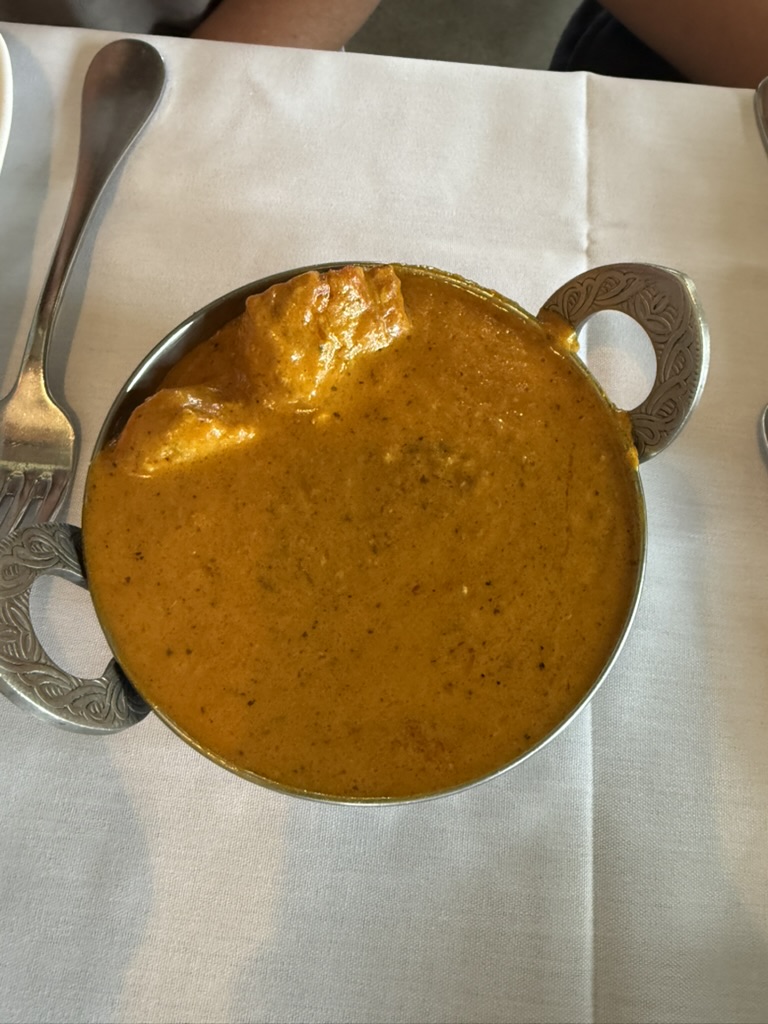 Had the paneer masala and it was delicious, rich and creamy, I got spice level 3/6 and it was perfect. The black pepper and onion naan was unique and delicious. Kind and attentive service, would definitley recommend!