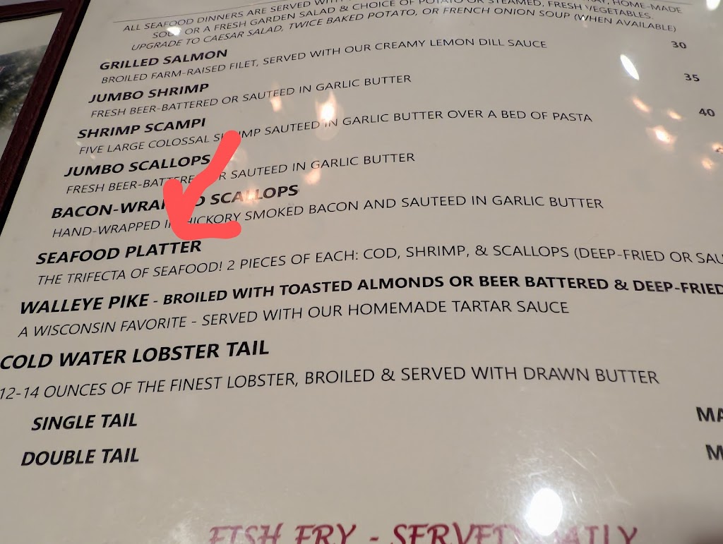 Perfect casual supper club atmosphere with an up north feel. Service, food and cocktails were excellent. A great Wisconsin dinner.
