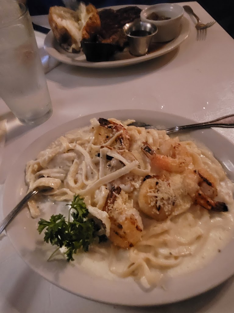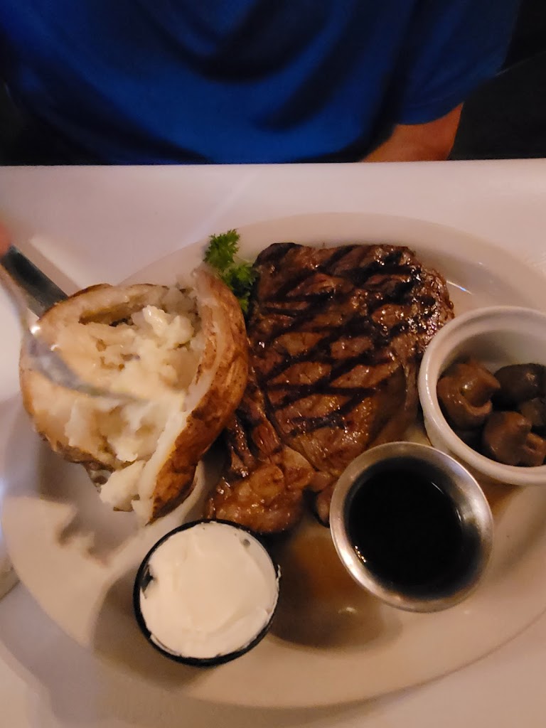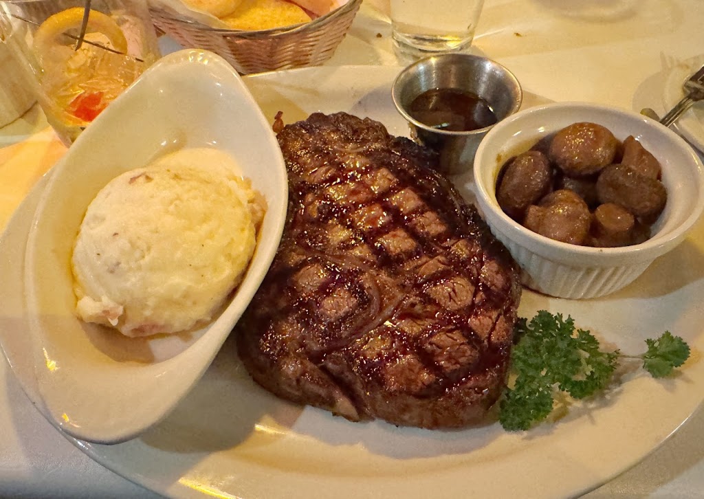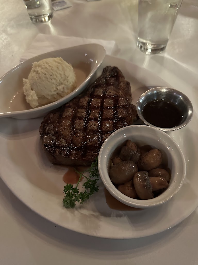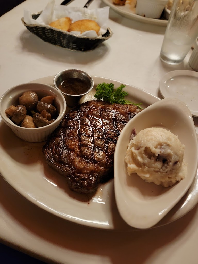 My husband had 14oz boneless ribeye. Steak was cooked to perfection at med rare. Everything was outstanding including the old fashioned. I had shrimp Alfredo. Service was top notch.