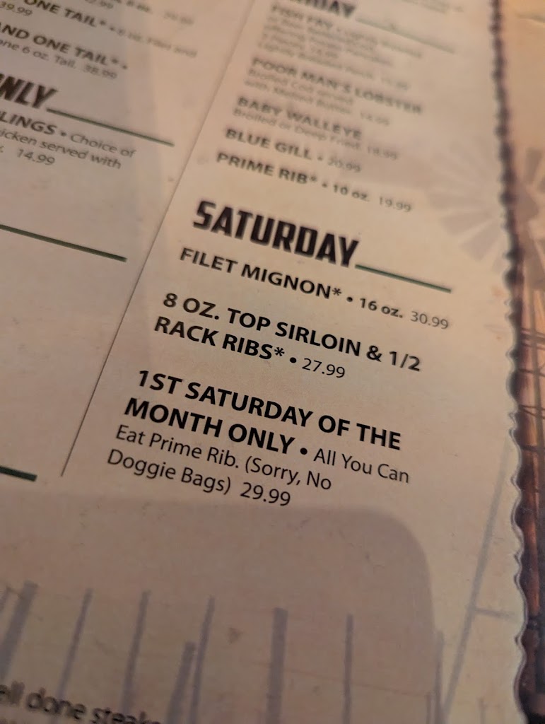 All you can eat prime rib- tender. Juicy. Quick on the "refills". Good flavor.
