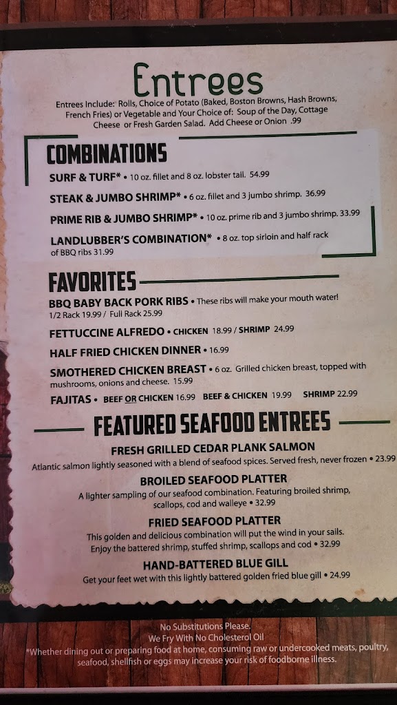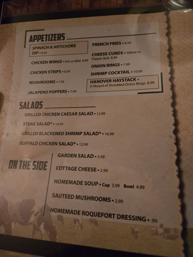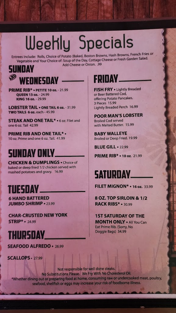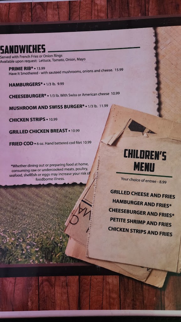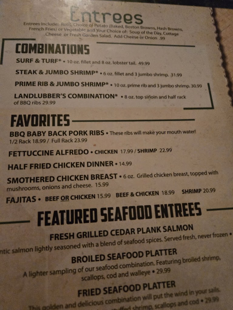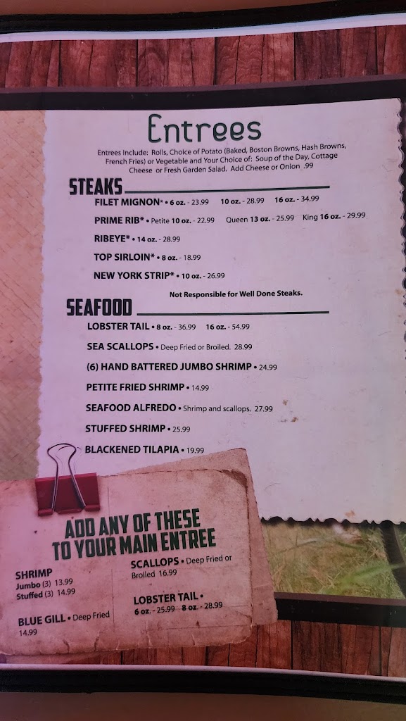 Exceptional place for not being in a bigger town, I had prime rib "rare" and potatoes with French onion soup. Cheese cake and dbl chocolate moose to follow up. Everything exceeded my expectations and have no complaints the staff are very nice and quick with their service! Their brandy old fashioned sweet was made perfect!