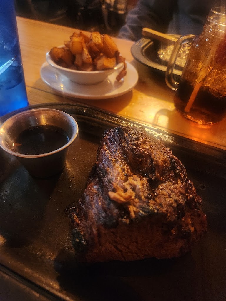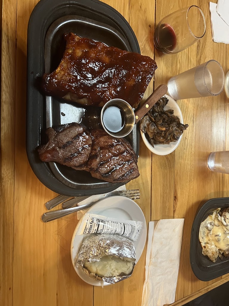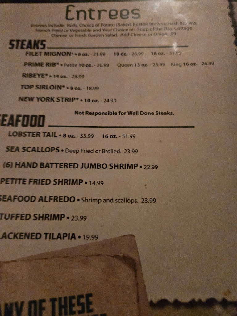 I really hate to complain, but I have to be honest, so the restaurant can make some changes and make the experience even better. First, the Prime Rib was extremely stringy, lots of tough stringy tendon in the steak, my knife had a hard time cutting through it, next the Prime Rib was way too salty. You gotta get that cook to lay off the salt shaker or whatever seasoning you’re using is too salty. Next get some potato rolls and ditch the hamburger buns for rolls. That cheapened the dinner. Our waitress was doing her best, but she’s young and inexperienced. She seemed easily overwhelmed. The last thing I would personally like to see or hear, play some music. Not loud but maybe some music will help quiet down all the loud chattering voices. I don’t go out to dinner to hear people complaining loudly about their personal lives.