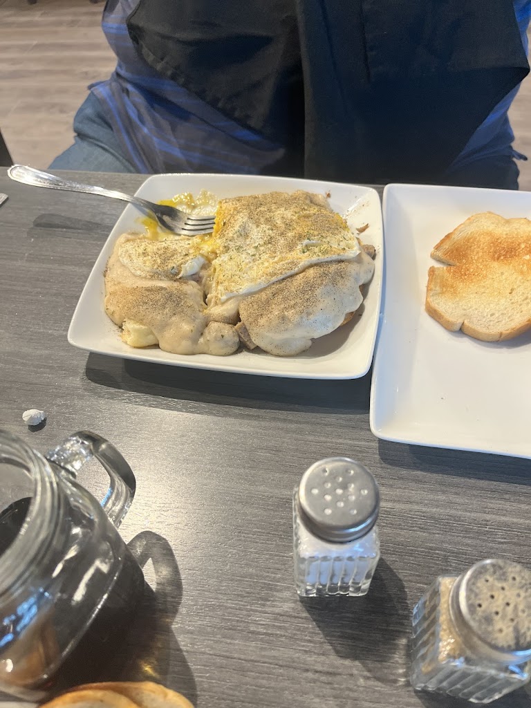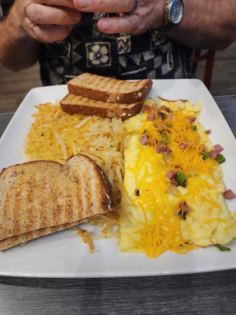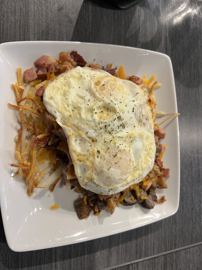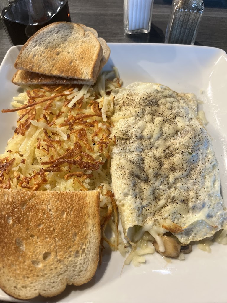Best Philly cheese steak omelet in GB. Generous amounts of tender steak folded with fresh sautéed veggies in a nice egg omelet. Hold the cheese sauce to truly enjoy the taste of this breakfast item