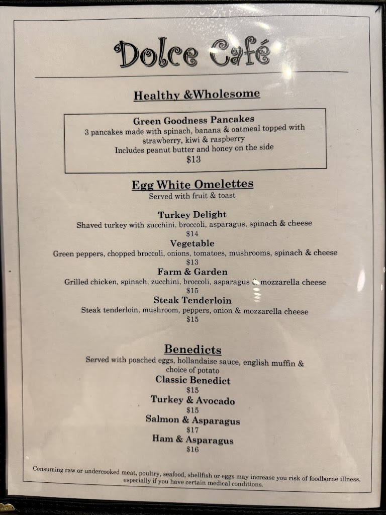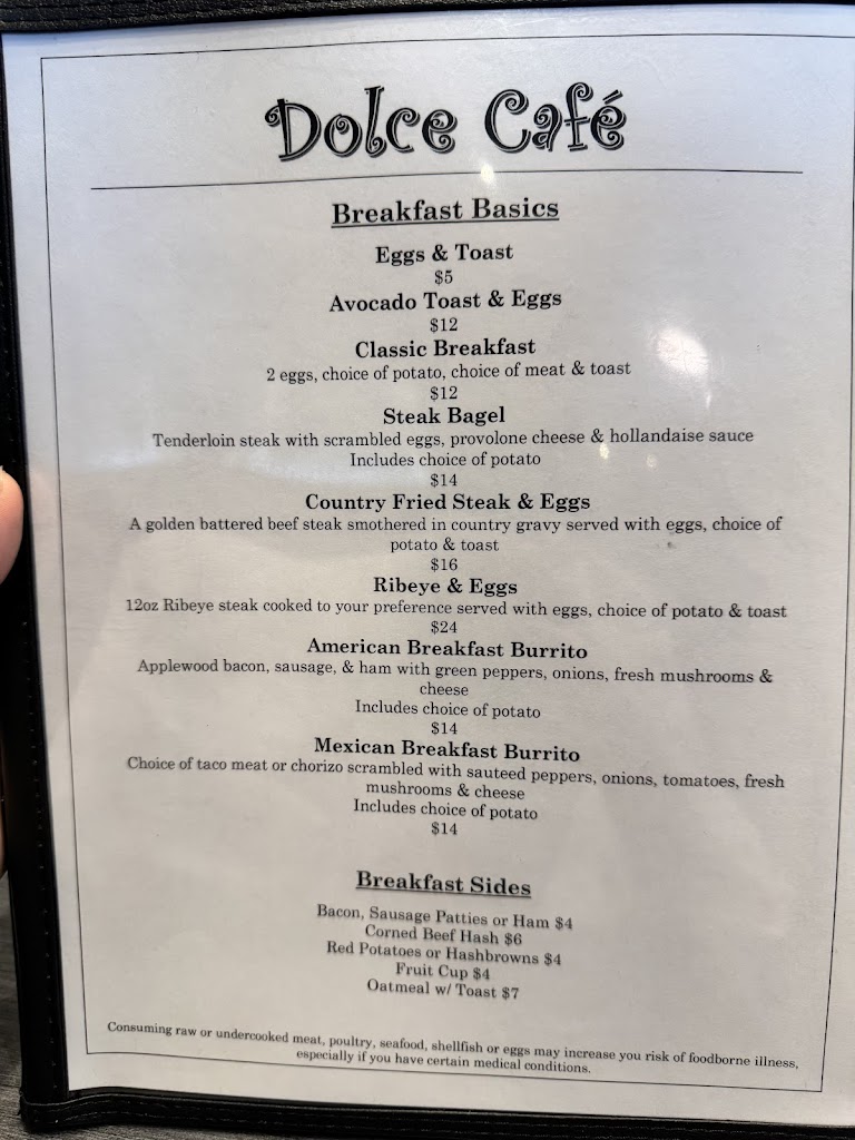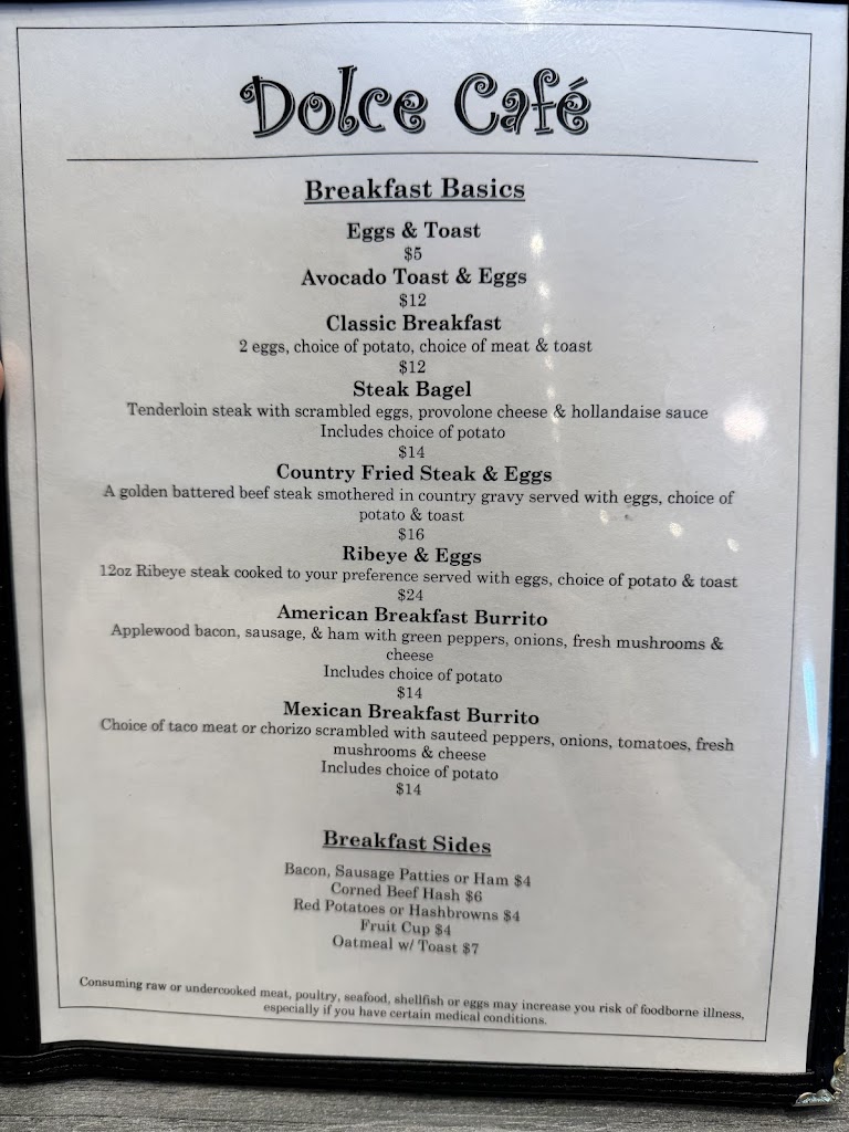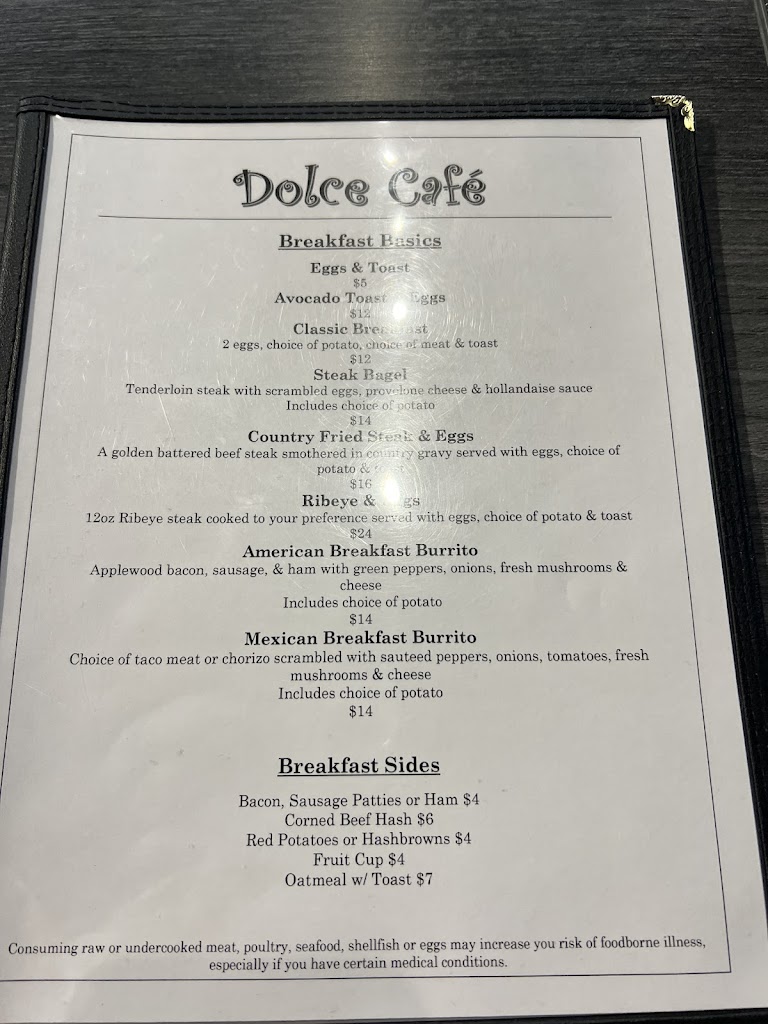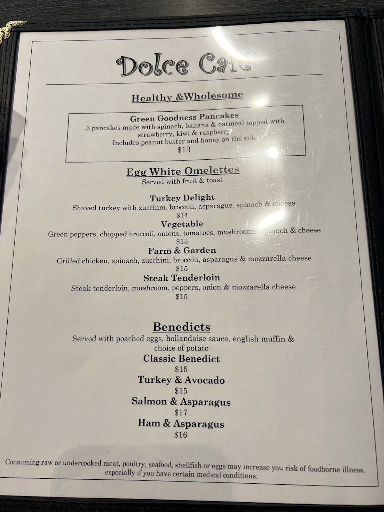 We had a great breakfast experience at the Dolce Cafe! The food was terrific, the wait staff was awesome, and the atmosphere inviting. Plenty of room for our big group and we were able to get seated quickly. The wait staff were very attentive, my coffee was never cold. The place was amazing as you could hear people from your table talk, in other words the music was at a low level. I highly recommend you check them out, it’s a bit hard to find as there is only signage in the window, but well worth it!