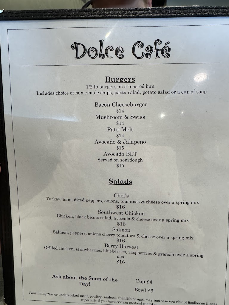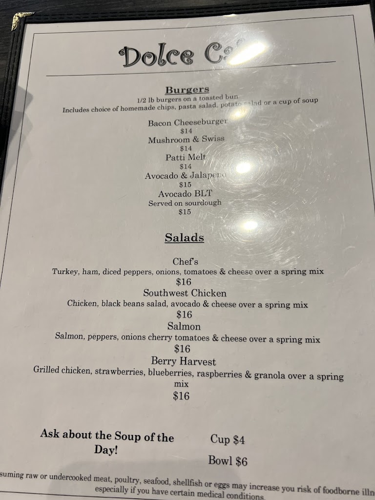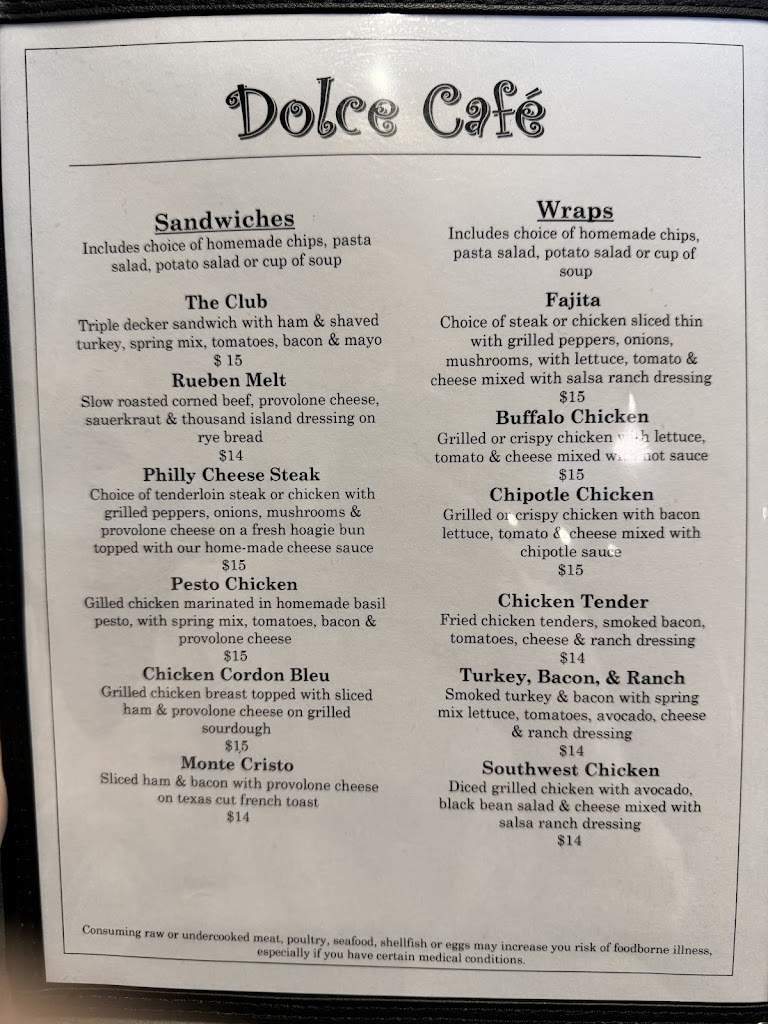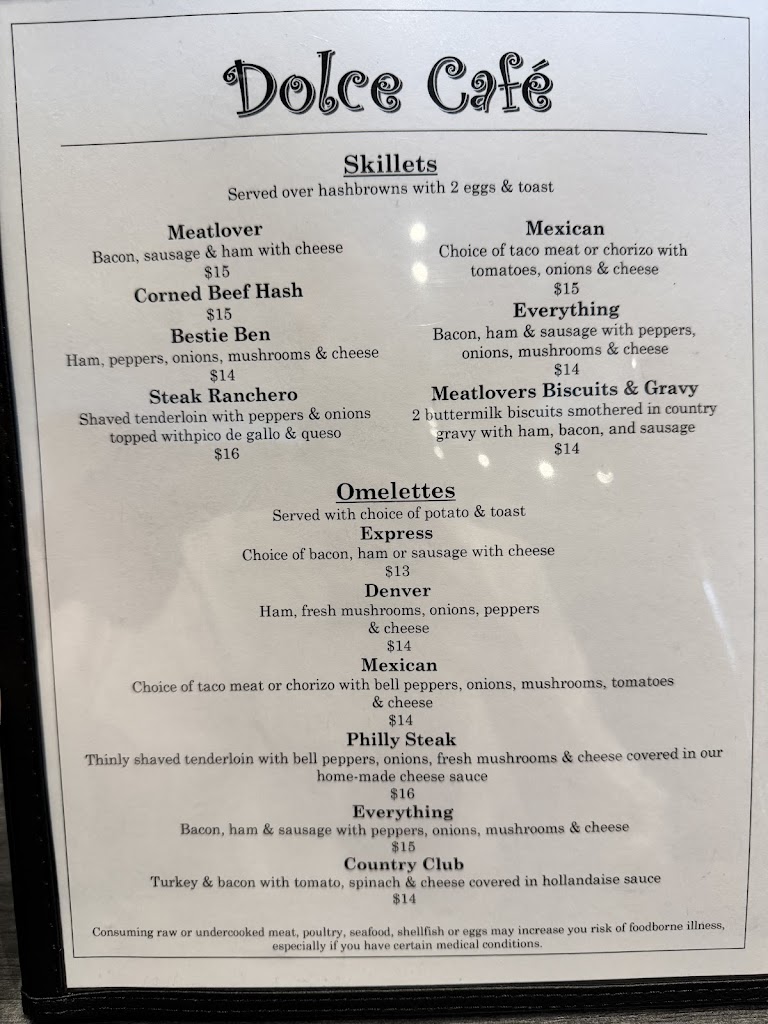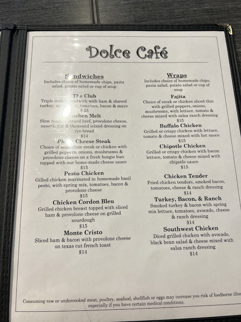 We had a great breakfast experience at the Dolce Cafe! The food was terrific, the wait staff was awesome, and the atmosphere inviting. Plenty of room for our big group and we were able to get seated quickly. The wait staff were very attentive, my coffee was never cold. The place was amazing as you could hear people from your table talk, in other words the music was at a low level. I highly recommend you check them out, it’s a bit hard to find as there is only signage in the window, but well worth it!
