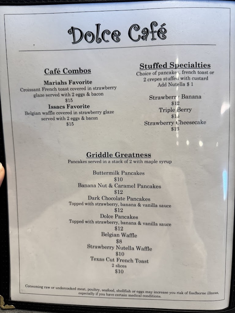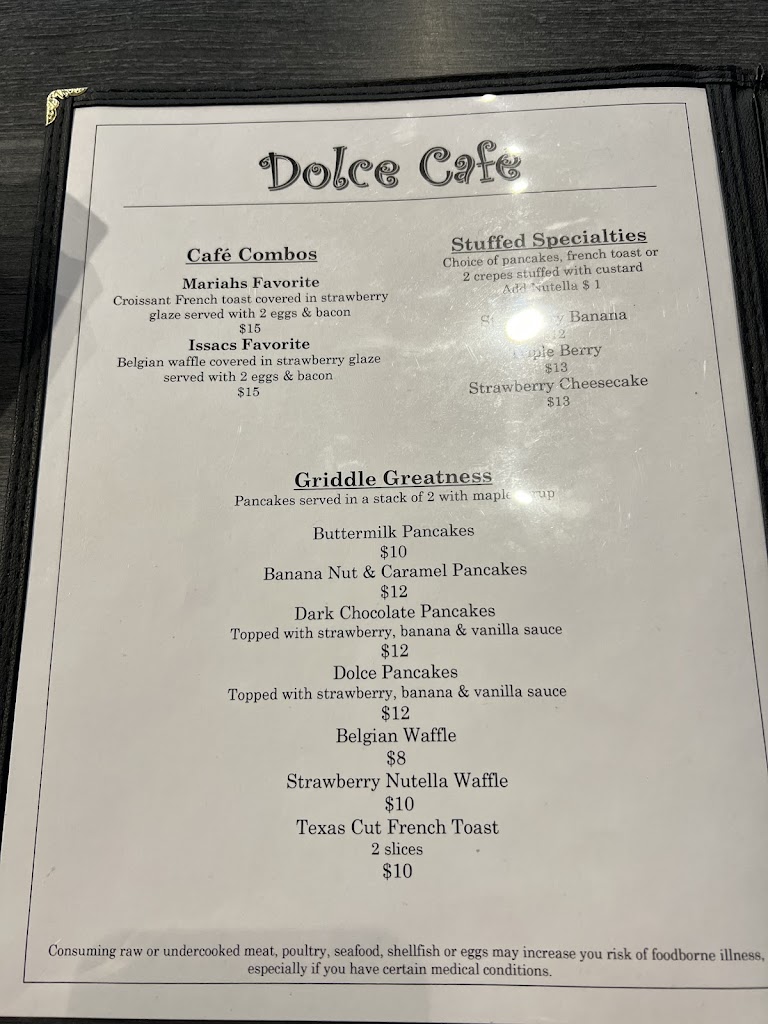 For a new establishment, Dolce Cafe excelled!! They had excellent staff that sat us quickly, and the food was in great portions for the price!! Would recommend, my daughter and I really enjoyed ourselves